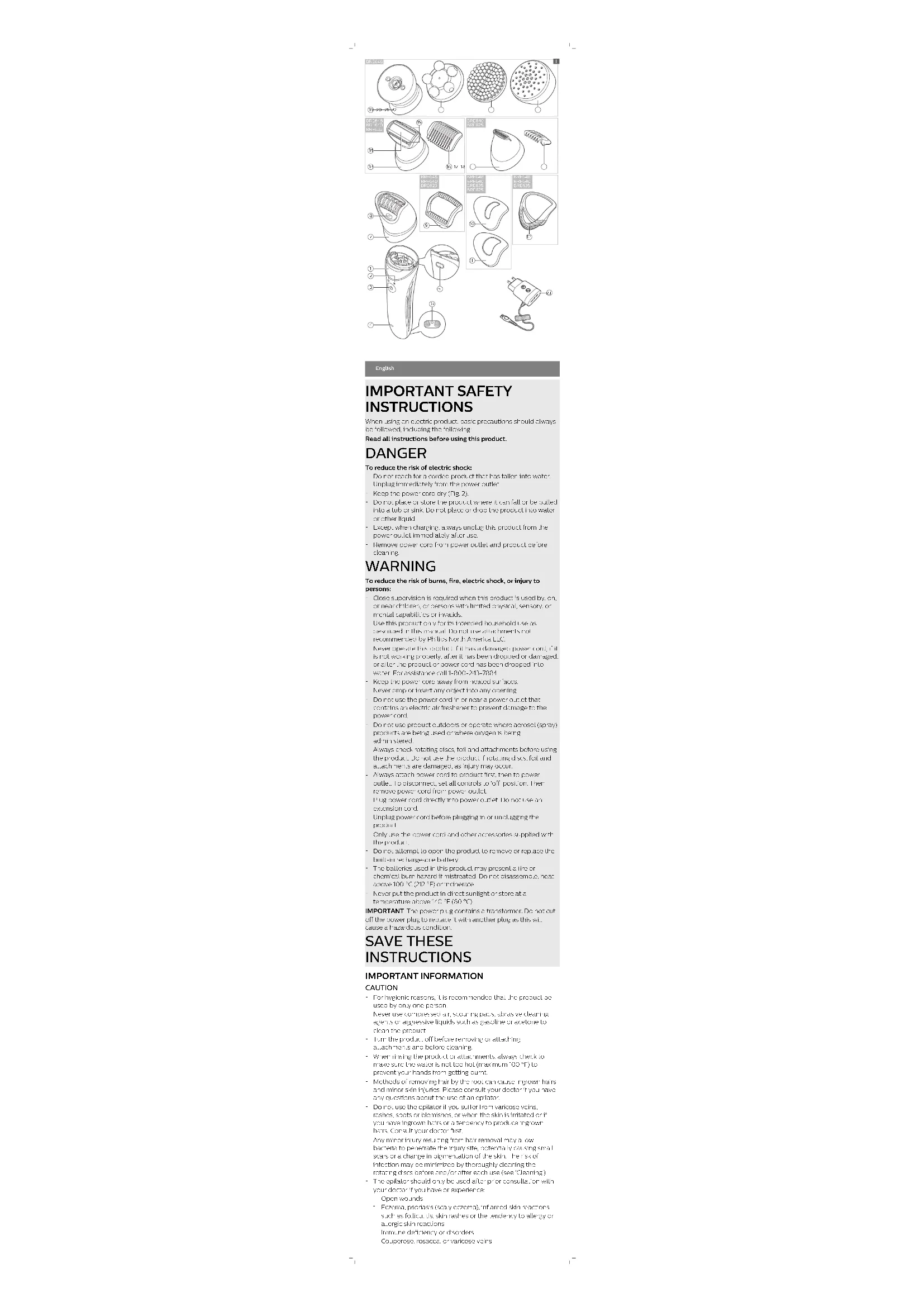 Your product is designed and manufactured with high quality materials and components, which can be recycled and reused. For recycling information, please contact your local waste management facilities or visit www.recycle.philips.com. Full Two-Year Warranty Philips North America LLC (USA) and Philips Electronics Ltd (Canada) warrant this new product (except shaving head and body exfoliation brush) against defects in materials or workmanship for a period of two years from the date of purchase, and agree to repair or replace any defective product without charge. IMPORTANT: This warranty does not cover damage resulting from accident, misuse or abuse, lack of reasonable care, the affixing of any attachment not provided with the product or loss of parts or subjecting the product to any but the specified voltage or batteries.* NO RESPONSIBILITY IS ASSUMED FOR ANY SPECIAL, INCIDENTAL OR CONSEQUENTIAL DAMAGES. In order to obtain warranty service, simply go to www.philips.com/support for assistance. It is suggested that for your protection you return shipments of product by insured mail, insurance prepaid. Damage occurring during shipment is not covered by this warranty. NOTE: No other warranty, written or oral, is authorized by Philips North America LLC. This warranty gives you specific legal rights, and you may also have other rights which vary from state to state, province to province or country to country. Some states do not allow the exclusion or limitation of incidental or consequential damages, so the above exclusion and limitations may not apply to you. *Read enclosed instructions carefully. 45-Day Money-Back Guarantee If you are not fully satisfied with your product send the product back and we’ll refund you the full purchase price. The product must be shipped prepaid by insured mail, insurance prepaid, have the original sales receipt, indicating purchase price and date of purchase, and the money-back guarantee return authorization form enclosed. We cannot be responsible for lost mail. The product must be postmarked no later than 45 days after the date of purchase. Philips reserves the right to verify the purchase price of the product and limit refunds not to exceed suggested retail price. To obtain money-back guarantee return authorization form, call 1-800-234-7884 (in US only) or 1-886-800-9311 (in Canada only) for assistance. Delivery of refund check will occur 6–8 weeks after receipt of returned product.Español INSTRUCCIONES IMPORTANTES DE SEGURIDAD Cuando utilice un producto eléctrico, siempre debe seguir las precauciones básicas, incluidas las siguientes: Lea todas las instrucciones antes de usar este producto. PELIGRO Para reducir el riesgo de descarga eléctrica: