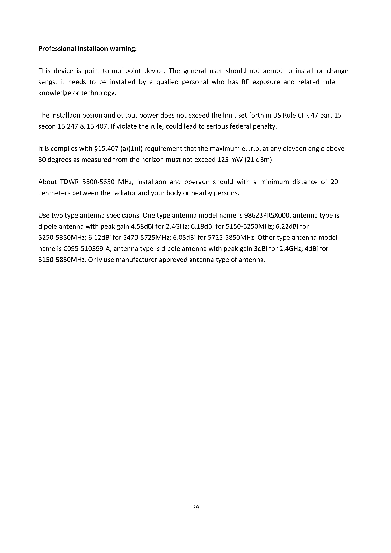 It is complies with §15.407 (a)(1)(i) requirement that the maximum e.i.r.p. at any elevation angle above 30 degrees as measured from the horizon must not exceed 125 mW (21 dBm). About TDWR 5600-5650 MHz, installation and operation should with a minimum distance of 20 centimeters between the radiator and your body or nearby persons. Use two type antenna specifications. One type antenna model name is 98623PRSX000, antenna type is dipole antenna with peak gain 4.58dBi for 2.4GHz; 6.18dBi for 5150-5250MHz; 6.22dBi for 5250-5350MHz; 6.12dBi for 5470-5725MHz; 6.05dBi for 5725-5850MHz. Other type antenna model name is C095-510399-A, antenna type is dipole antenna with peak gain 3dBi for 2.4GHz; 4dBi for 5150-5850MHz. Only use manufacturer approved antenna type of antenna.30