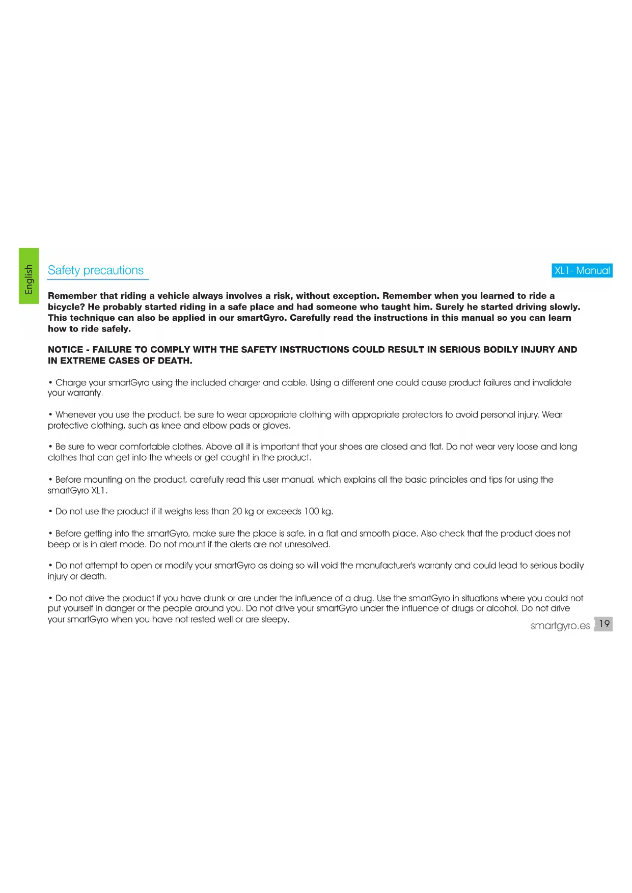 - Do not drive the product if you have drunk or are under the influence of a drug. Use the smartGyro in situations where you could not put yourself in danger or the people around you. Do not drive your smartGyro under the influence of drugs or alcohol. Do not drive your smartGyro when you have not rested well or are sleepy. English