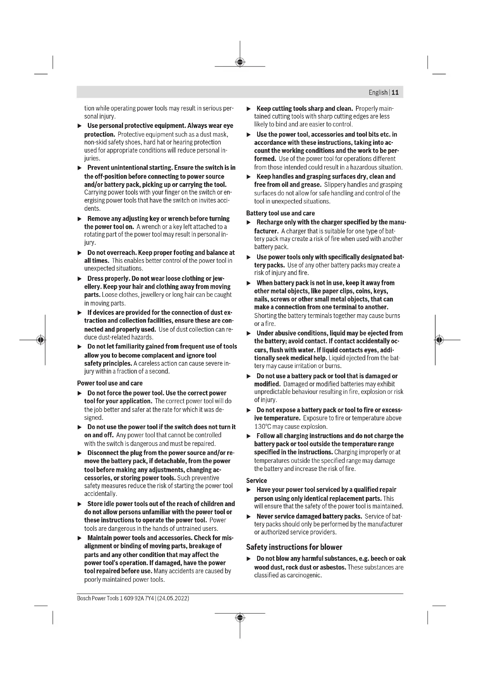 äußeren Abmessung größer als 25cm sind, im Einzel- handelsgeschäft oder in unmittelbarer Nähe hierzu un- entgeltlich zurückzunehmen; die Rücknahme darf nicht an den Kauf eines Elektro- oder Elektronikgerätes ge- knüpft werden und ist auf drei Altgeräte pro Geräteart beschränkt. Der Vertreiber hat beim Abschluss des Kaufvertrags für das neue Elektro- oder Elektronikgerät den Endnutzer über die Möglichkeit zur unentgeltlichen Rückgabe bzw. Abholung des Altgeräts zu informieren und den Endnutzer nach seiner Absicht zu befragen, ob bei der Auslieferung des neuen Ge- räts ein Altgerät zurückgegeben wird. Dies gilt auch bei Vertrieb unter Verwendung von Fernkom- munikationsmitteln, wenn die Lager- und Versandflächen für Elektro- und Elektronikgeräte mindestens 400m² betragen oder die gesamten Lager- und Versandflächen mindestens 800m² betragen, wobei die unentgeltliche Abholung auf Elektro- und Elektronikgeräte der Kategorien 1 (Wärmeüber- träger), 2 (Bildschirmgeräte) und 4 (Großgeräte mit mindes- tens einer äußeren Abmessung über 50cm) beschränkt ist. Für alle übrigen Elektro- und Elektronikgeräte muss der Ver- treiber geeignete Rückgabemöglichkeiten in zumutbarer Ent- fernung zum jeweiligen Endnutzer gewährleisten; das gilt auch für Altgeräte, die in keiner äußeren Abmessung größer als 25cm sind, die der Endnutzer zurückgeben will, ohne ein neues Gerät zu kaufen. Akkus/Batterien: Li-Ion: Bitte beachten Sie die Hinweise im Abschnitt Transport (sie- he „Transport“, Seite9). English Safety Instructions General Power Tool Safety Warnings WARNING Read all safety warnings, instruc- tions, illustrations and specifica- tions provided with this power tool. Failure to follow all in- structions listed below may result in electric shock, fire and/ or serious injury. Save all warnings and instructions for future reference. The term "power tool" in the warnings refers to your mains- operated (corded) power tool or battery-operated (cord- less) power tool. Work area safety u Keep work area clean and well lit. Cluttered or dark areas invite accidents. u Do not operate power tools in explosive atmospheres, such as in the presence of flammable liquids, gases or dust. Power tools create sparks which may ignite the dust or fumes. u Keep children and bystanders away while operating a power tool. Distractions can cause you to lose control. Electrical safety u Power tool plugs must match the outlet. Never modify the plug in any way. Do not use any adapter plugs with earthed (grounded) power tools. Unmodified plugs and matching outlets will reduce risk of electric shock. u Avoid body contact with earthed or grounded sur- faces, such as pipes, radiators, ranges and refrigerat- ors. There is an increased risk of electric shock if your body is earthed or grounded. u Do not expose power tools to rain or wet conditions. Water entering a power tool will increase the risk of elec- tric shock. u Do not abuse the cord. Never use the cord for carry- ing, pulling or unplugging the power tool. Keep cord away from heat, oil, sharp edges or moving parts. Damaged or entangled cords increase the risk of electric shock. u When operating a power tool outdoors, use an exten- sion cord suitable for outdoor use. Use of a cord suit- able for outdoor use reduces the risk of electric shock. u If operating a power tool in a damp location is un- avoidable, use a residual current device (RCD) protec- ted supply. Use of an RCD reduces the risk of electric shock. Personal safety u Stay alert, watch what you are doing and use common sense when operating a power tool. Do not use a power tool while you are tired or under the influence of drugs, alcohol or medication. A moment of inatten- 1 609 92A 7Y4 | (24.05.2022) Bosch Power ToolsEnglish | 11 tion while operating power tools may result in serious per- sonal injury. u Use personal protective equipment. Always wear eye protection. Protective equipment such as a dust mask, non-skid safety shoes, hard hat or hearing protection used for appropriate conditions will reduce personal in- juries. u Prevent unintentional starting. Ensure the switch is in the off-position before connecting to power source and/or battery pack, picking up or carrying the tool. Carrying power tools with your finger on the switch or en- ergising power tools that have the switch on invites acci- dents. u Remove any adjusting key or wrench before turning the power tool on. A wrench or a key left attached to a rotating part of the power tool may result in personal in- jury. u Do not overreach. Keep proper footing and balance at all times. This enables better control of the power tool in unexpected situations. u Dress properly. Do not wear loose clothing or jew- ellery. Keep your hair and clothing away from moving parts. Loose clothes, jewellery or long hair can be caught in moving parts. u If devices are provided for the connection of dust ex- traction and collection facilities, ensure these are con- nected and properly used. Use of dust collection can re- duce dust-related hazards. u Do not let familiarity gained from frequent use of tools allow you to become complacent and ignore tool safety principles. A careless action can cause severe in- jury within a fraction of a second. Power tool use and care u Do not force the power tool. Use the correct power tool for your application. The correct power tool will do the job better and safer at the rate for which it was de- signed. u Do not use the power tool if the switch does not turn it on and off. Any power tool that cannot be controlled with the switch is dangerous and must be repaired. u Disconnect the plug from the power source and/or re- move the battery pack, if detachable, from the power tool before making any adjustments, changing ac- cessories, or storing power tools. Such preventive safety measures reduce the risk of starting the power tool accidentally. u Store idle power tools out of the reach of children and do 