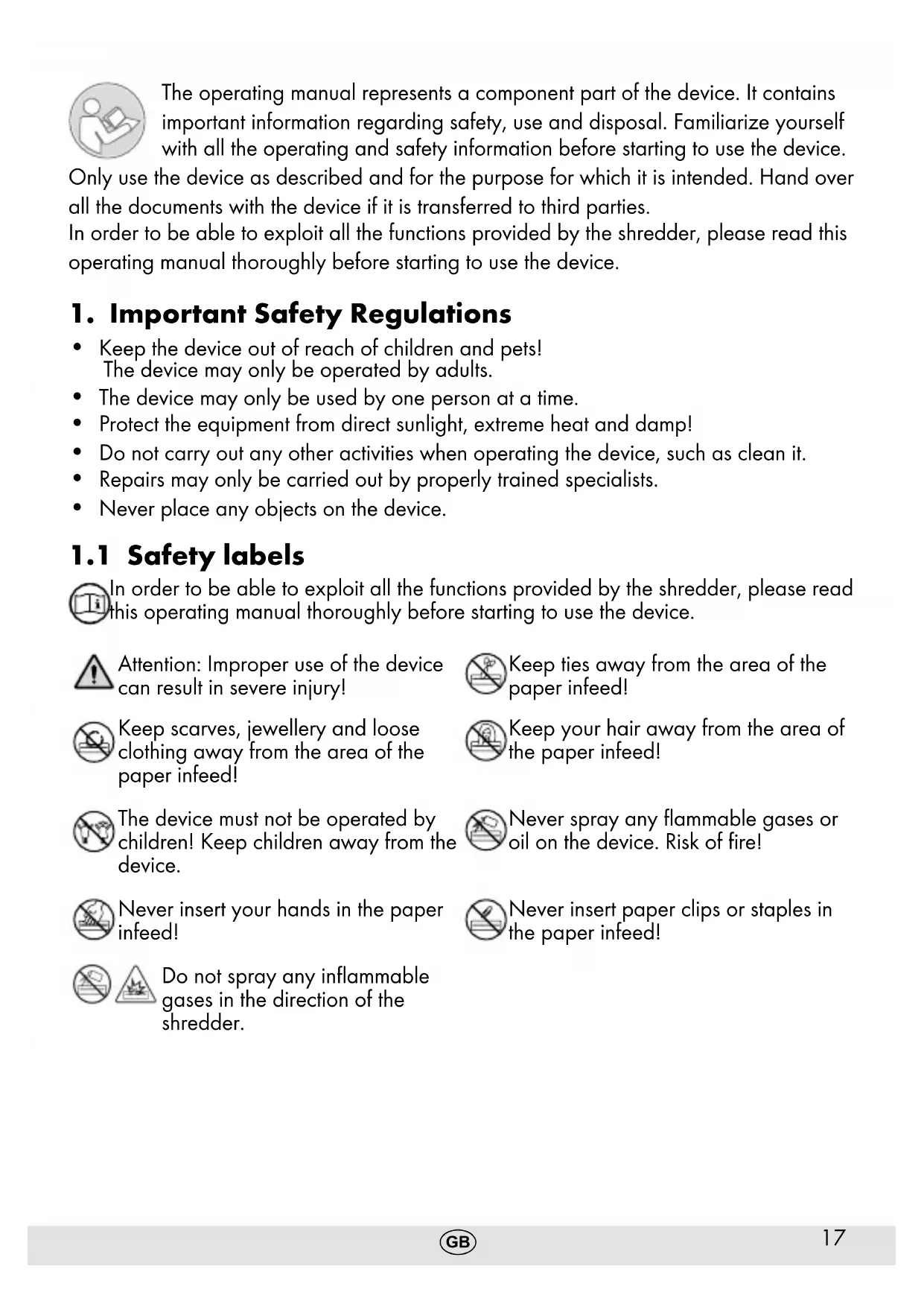 In order to be able to exploit all the functions provided by the shredder, please read this operating manual thoroughly before starting to use the device. Attention: Improper use of the device can result in severe injury! Keep ties away from the area of the paper infeed! Keep scarves, jewellery and loose clothing away from the area of the paper infeed! Keep your hair away from the area of the paper infeed! The device must not be operated by children! Keep children away from the device. Neversprayanyammablegasesor oilonthedevice.Riskofre! Never insert your hands in the paper infeed! Never insert paper clips or staples in the paper infeed! Donotsprayanyinammable gases in the direction of the shredder.18
