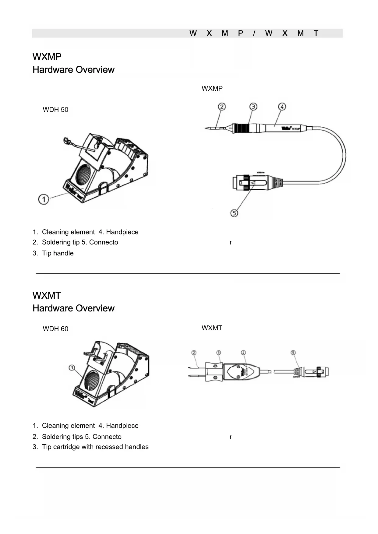 Order no. Description T0058765706 Handpiece WXMP with cable T0051515699 Safety rest WDH 50 T0054460399 RT 3 soldering tip 40 W T0058751816 Clip which attaches to the side of the rest and holds two RT tips T0051384199 Metal wool for cleaning element for WDC 2