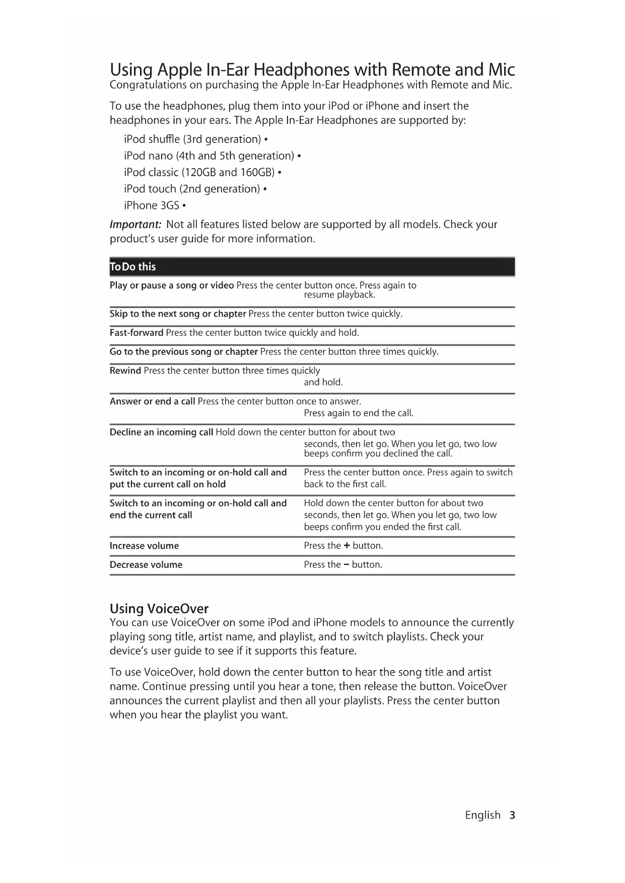 In-Ear Headphones with Remote and Mic Important Product Information Guide Guide d’informations importantes sur le produit Wichtige Produktinformationen Guía de información importante del producto Guida alle informazioni importanti sul prodottoEnglish 3English 3 Using Apple In-Ear Headphones with Remote and Mic Congratulations on purchasing the Apple In-Ear Headphones with Remote and Mic. To use the headphones, plug them into your iPod or iPhone and insert the headphones in your ears. The Apple In-Ear Headphones are supported by: iPod shue (3rd generation) Â iPod nano (4th and 5th generation) Â iPod classic (120GB and 160GB) Â iPod touch (2nd generation) Â iPhone 3GS Â Important: Not all features listed below are supported by all models. Check your product’s user guide for more information. To Do this Play or pause a song or video Press the center button once. Press again to resume playback. Skip to the next song or chapter Press the center button twice quickly. Fast-forward Press the center button twice quickly and hold. Go to the previous song or chapter Press the center button three times quickly. Rewind Press the center button three times quickly and hold. Answer or end a call Press the center button once to answer. Press again to end the call. Decline an incoming call Hold down the center button for about two seconds, then let go. When you let go, two low beeps conrm you declined the call. Switch to an incoming or on-hold call and put the current call on hold Press the center button once. Press again to switch back to the rst call. Switch to an incoming or on-hold call and end the current call Hold down the center button for about two seconds, then let go. When you let go, two low beeps conrm you ended the rst call. Increase volume Press the ∂ button. Decrease volume Press the D button. Using VoiceOver You can use VoiceOver on some iPod and iPhone models to announce the currently playing song title, artist name, and playlist, and to switch playlists. Check your device’s user guide to see if it supports this feature. To use VoiceOver, hold down the center button to hear the song title and artist name. Continue pressing until you hear a tone, then release the button. VoiceOver announces the current playlist and then all your playlists. Press the center button when you hear the playlist you want.4 English English 5 Getting the Best Sound Getting the best sound with your Apple In-Ear Headphones with Remote and Mic requires using the eartips that provide the best seal. Try all three sizes (S, M, L) in each ear and choose the ones that t snugly and comfortably in your ear canal, like a pair of earplugs. When the t is right, most outside noises are blocked and music has a rich bass sound. Cleaning or Replacing the Mesh Caps The mesh caps protect the headphone speakers from damage. If the mesh caps become clogged with earwax or the sound becomes mued, clean or replace them (an extra pair is included). To clean the mesh caps, rst remove the silicone eartips, then unscrew the mesh caps from the headphones. Soak the mesh caps in very hot tap water with a drop of dish soap for 30 minutes. When the wire mesh is completely unclogged, rinse with cool water and dry thoroughly before screwing them securely back onto the headphones and replacing the silicone eartips.