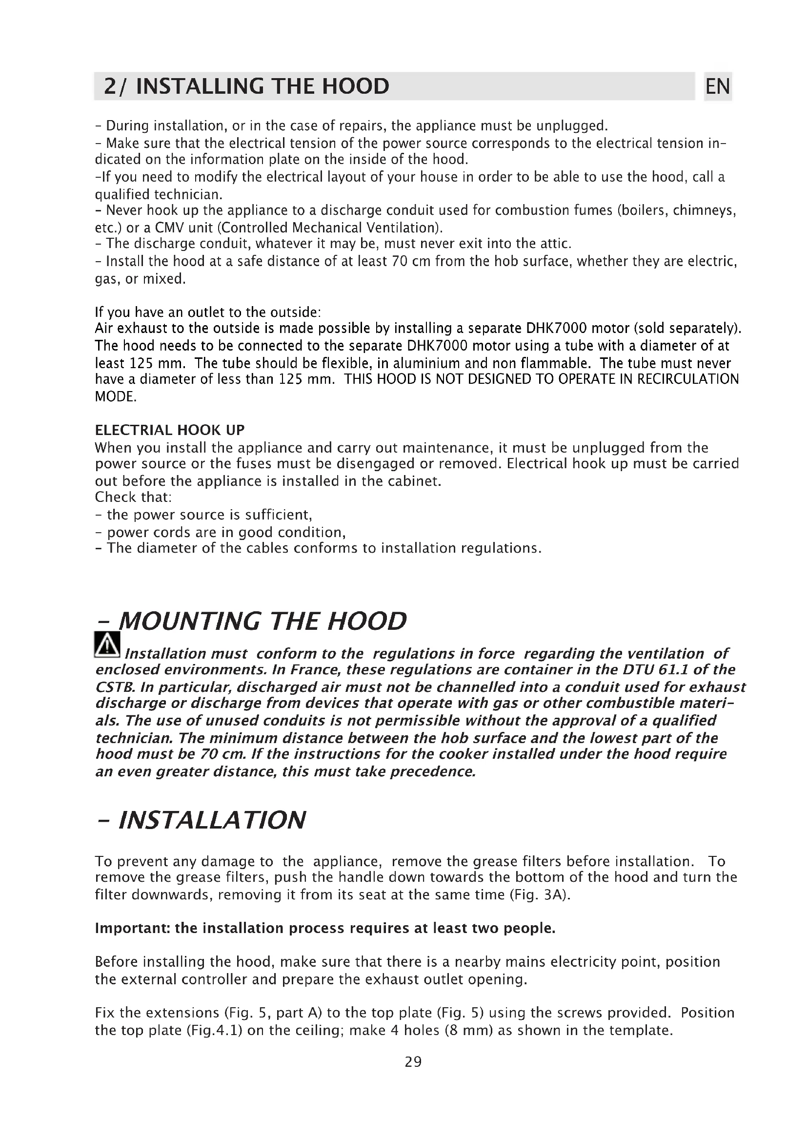- During installation, or in the case of repairs, the appliance must be unplugged. - Make sure that the electrical tension of the power source corresponds to the electrical tension in- dicated on the information plate on the inside of the hood. -If you need to modify the electrical layout of your house in order to be able to use the hood, call a qualified technician. - Never hook up the appliance to a discharge conduit used for combustion fumes (boilers, chimneys, etc.) or a CMV unit (Controlled Mechanical Ventilation). - The discharge conduit, whatever it may be, must never exit into the attic. - Install the hood at a safe distance of at least 70 cm from the hob surface, whether they are electric, gas, or mixed. If you have an outlet to the outside: Air exhaust to the outside is made possible by installing a separate DHK7000 motor (sold separately). The hood needs to be connected to the separate DHK7000 motor using a tube with a diameter of at least 1 mm. The tube should be flexible, in aluminium and non flammable. The tube must never have a diameter of less than 1 mm. THIS HOOD IS NOT DESIGNED TO OPERATE IN RECIRCULATION MODE.