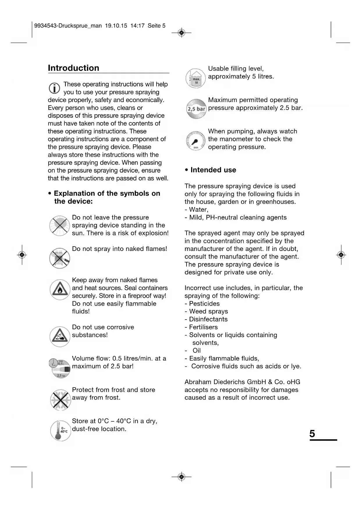 - Intended use The pressure spraying device is used only for spraying the following fluids in the house, garden or in greenhouses. - Water, - Mild, PH-neutral cleaning agents The sprayed agent may only be sprayed in the concentration specified by the manufacturer of the agent. If in doubt, consult the manufacturer of the agent. The pressure spraying device is designed for private use only. Incorrect use includes, in particular, the spraying of the following: - Pesticides - Weed sprays - Disinfectants - Fertilisers - Solvents or liquids containing solvents, -Oil - Easily flammable fluids, - Corrosive fluids such as acids or lye. Abraham Diederichs GmbH & Co. oHG accepts no responsibility for damages caused as a result of incorrect use. 9934543-Drucksprue_man 19.10.15 14:17 Seite 56