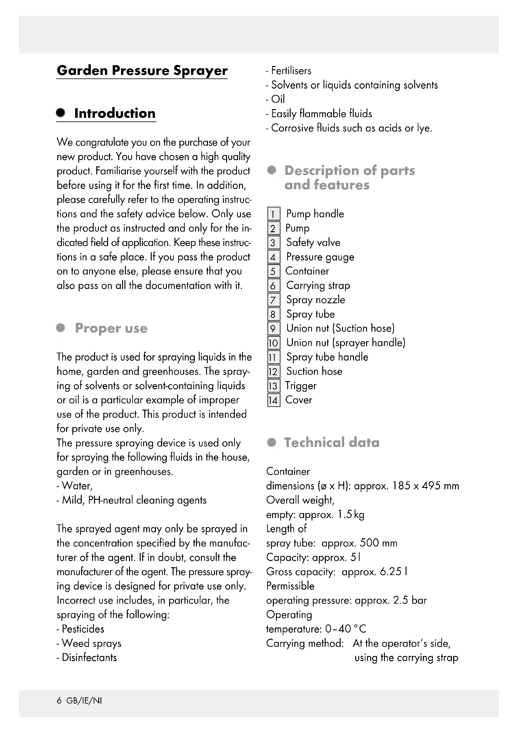 Cover Technical data Container dimensions (ø x H): approx. 185 x 495 mm Overall weight, empty: approx. 1.5 kg Length of spray tube: approx. 500 mm Capacity: approx. 5 l Gross capacity: approx. 6.25 l Permissible operating pressure: approx. 2.5 bar Operating temperature: 0–40 °C Carrying method: At the operator‘s side, using the carrying strap7 GB/IE/NI Volume flow: Jet stream: max. 0.75 l / min Misty spray: max. 0.70 l / min Waterfall stream: max.