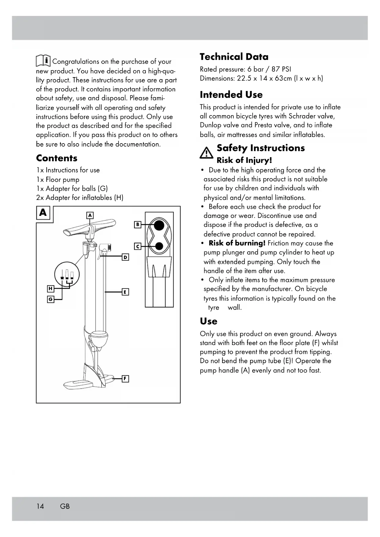 - Only inflate items to the maximum pressure specified by the manufacturer. On bicycle tyres this information is typically found on the tyre wall. Use Only use this product on even ground. Always stand with both feet on the floor plate (F) whilst pumping to prevent the product from tipping. Do not bend the pump tube (E)! Operate the pump handle (A) evenly and not too fast.