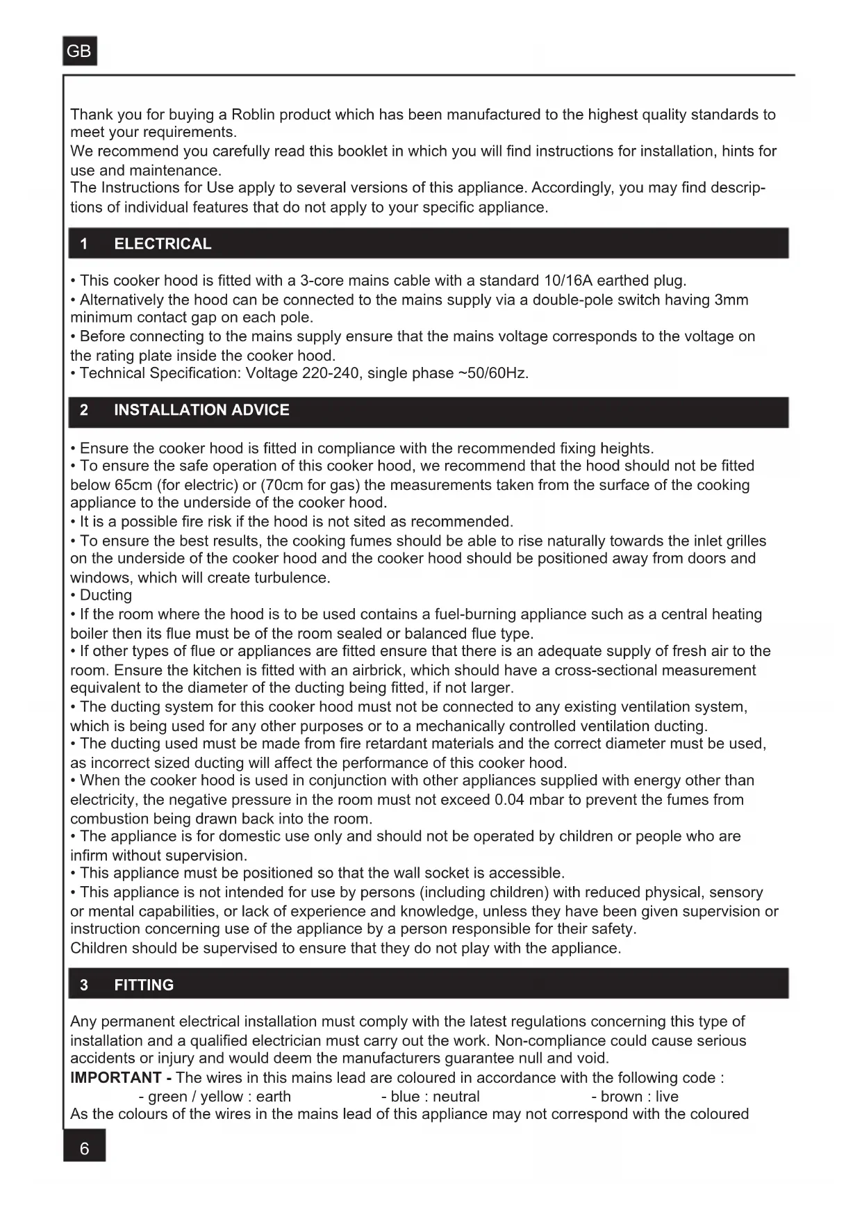 Thank you for buying a Roblin product which has been manufactured to the highest quality standards to meet your requirements. We recommend you carefully read this booklet in which you will nd instructions for installation, hints for use and maintenance. The Instructions for Use apply to several versions of this appliance. Accordingly, you may nd descrip- tions of individual features that do not apply to your specic appliance. 1 ELECTRICAL