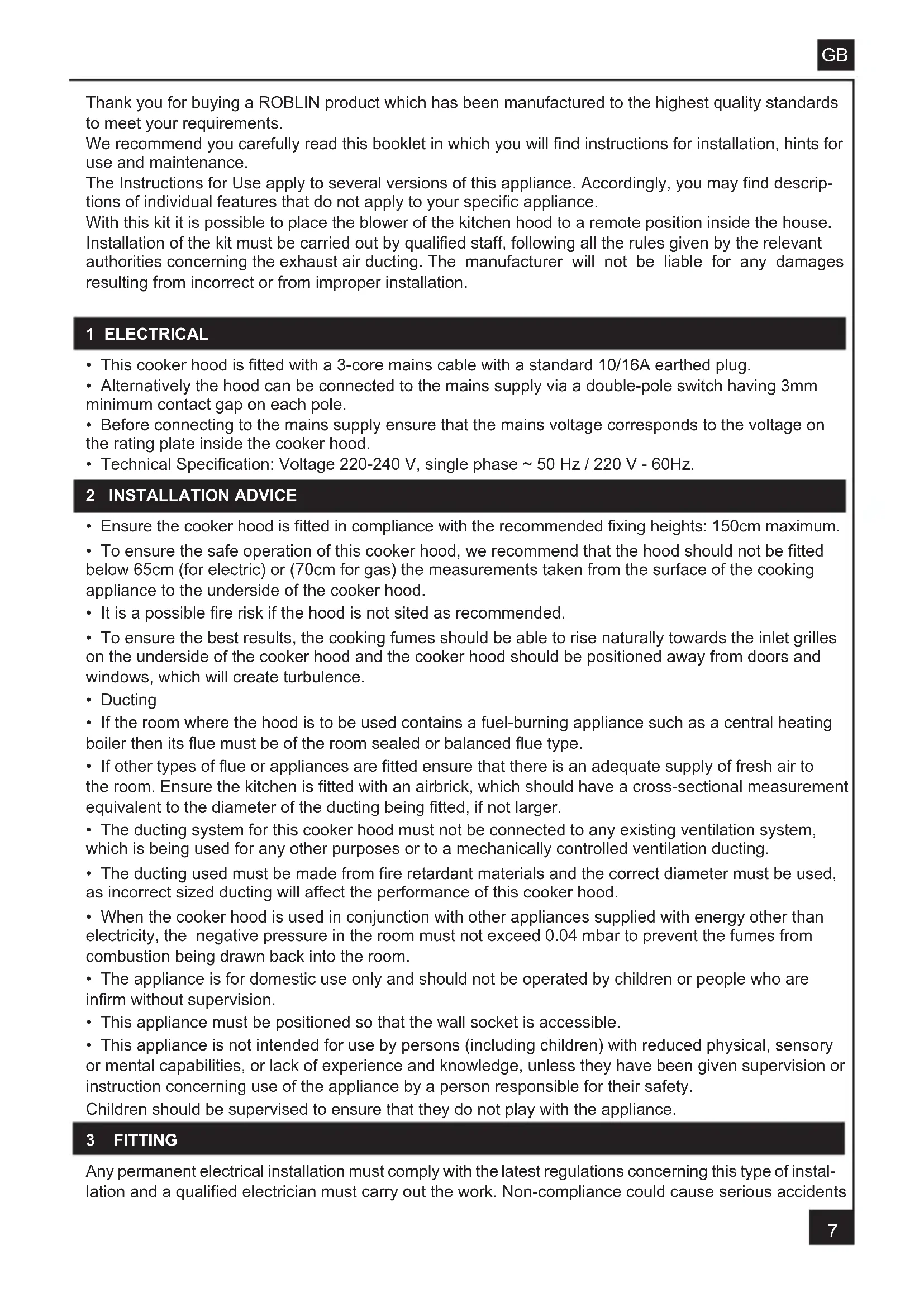 Thank you for buying a ROBLIN product which has been manufactured to the highest quality standards to meet your requirements. We recommend you carefully read this booklet in which you will nd instructions for installation, hints for use and maintenance. The Instructions for Use apply to several versions of this appliance. Accordingly, you may nd descrip- tions of individual features that do not apply to your specic appliance. With this kit it is possible to place the blower of the kitchen hood to a remote position inside the house. Installation of the kit must be carried out by qualied staff, following all the rules given by the relevant authorities concerning the exhaust air ducting. The manufacturer will not be liable for any damages resulting from incorrect or from improper installation. 1 ELECTRICAL