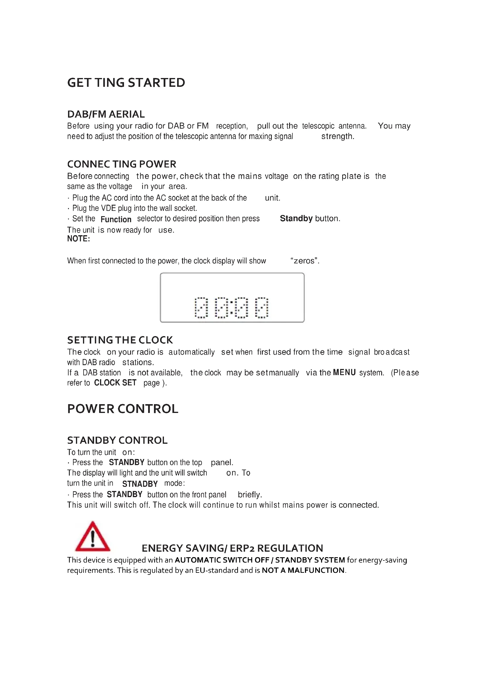 DAB/FM AERIAL Before using your radio for DAB or FM reception, pull out the telescopic antenna. You may need to adjust the position of the telescopic antenna for maxing signal strength. CONNEC TING POWER Before connecting the power, check that the mains voltage on the rating plate is the same as the voltage your area. Plug the AC cord into the AC socket at the back of the unit. Plug the VDE plug into the wall socket. Set the Function selector to desired position then press Standby button. The unit now ready for use. NOTE: