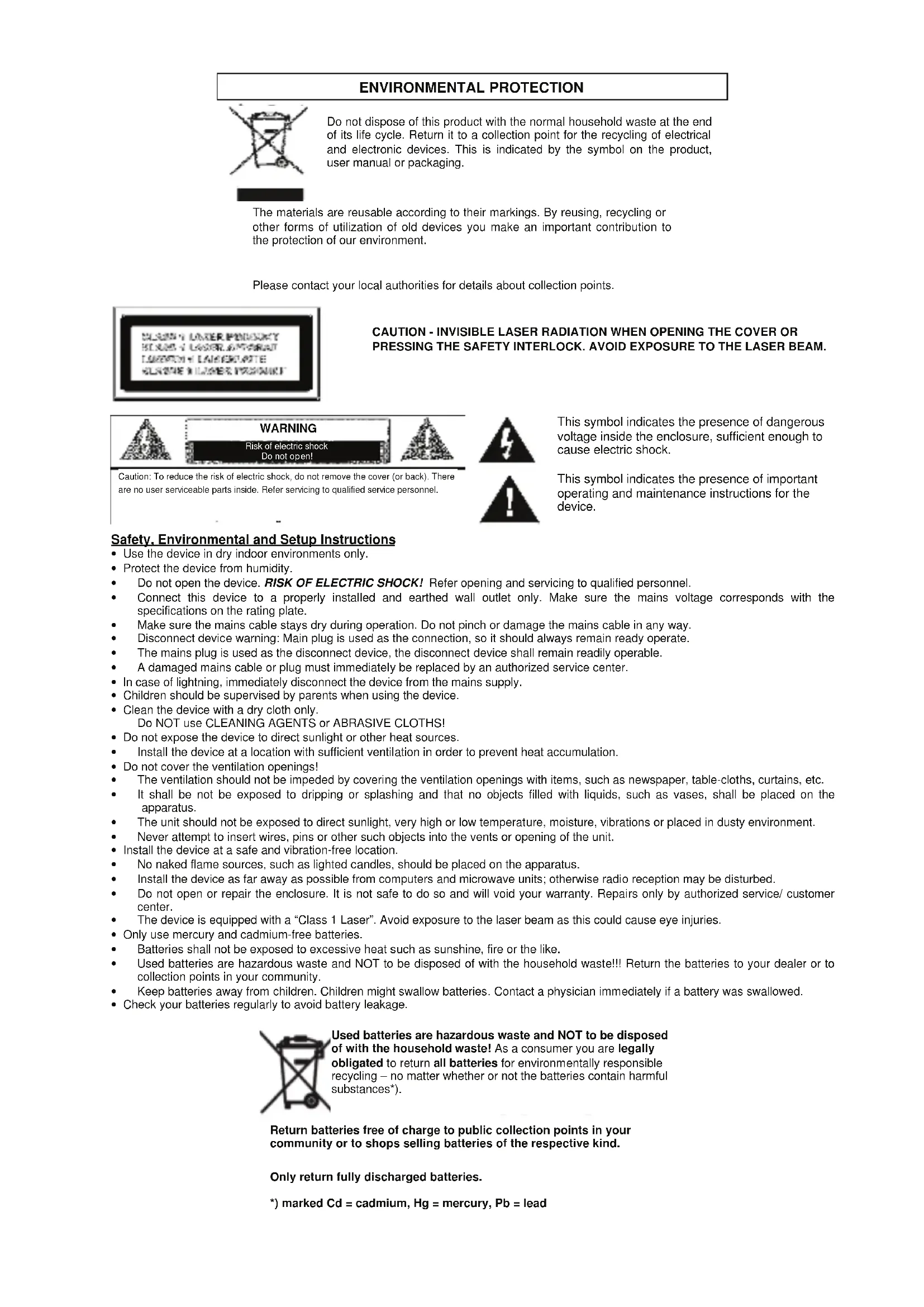 CAUTION - INVISIBLE LASER RADIATION WHEN OPENING THE COVER OR PRESSING THE SAFETY INTERLOCK. AVOID EXPOSURE TO THE LASER BEAM. ENVIRONMENTAL PROTECTION Do not dispose of this product with the normal household waste at the end of its life cycle. Return it to a collection point for the recycling of electrical and electronic devices. This is indicated by the symbol on the product, user manual or packaging. The materials are reusable according to their markings. By reusing, recycling or other forms of utilization of old devices you make an important contribution to the protection of our environment. Please contact your local authorities for details about collection points. WARNING Risk of electric shock Do not o