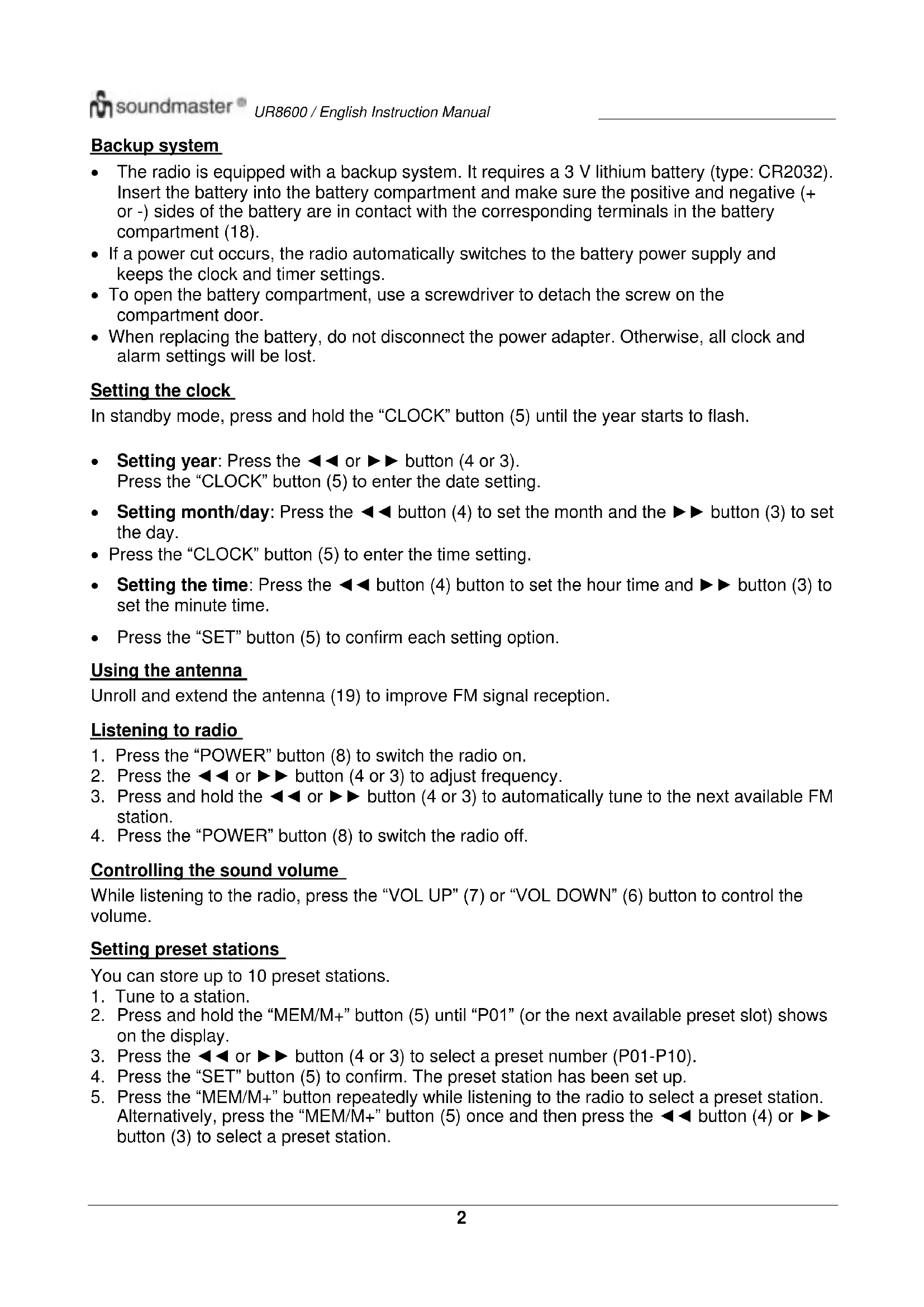 Download the instructions for your Radio in PDF format for free! Find your manual UR8600 - Soundmaster and take your electronic device back in hand. On this page are published all the documents necessary for the use of your device. UR8600 by Soundmaster.