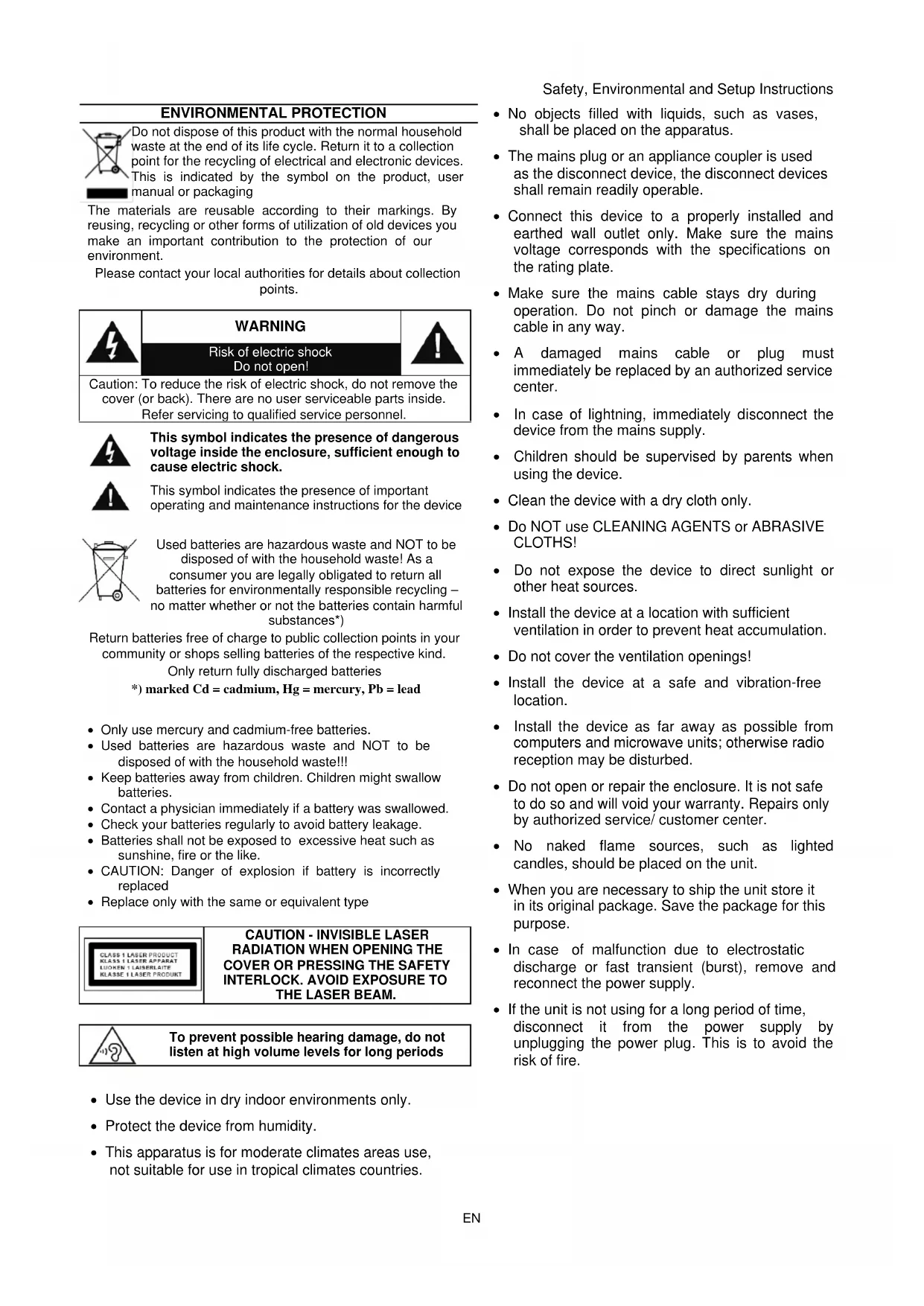 Return batteries free of charge to public collection points in your community or shops selling batteries of the respective kind. Only return fully discharged batteries *) marked Cd = cadmium, Hg = mercury, Pb = lead