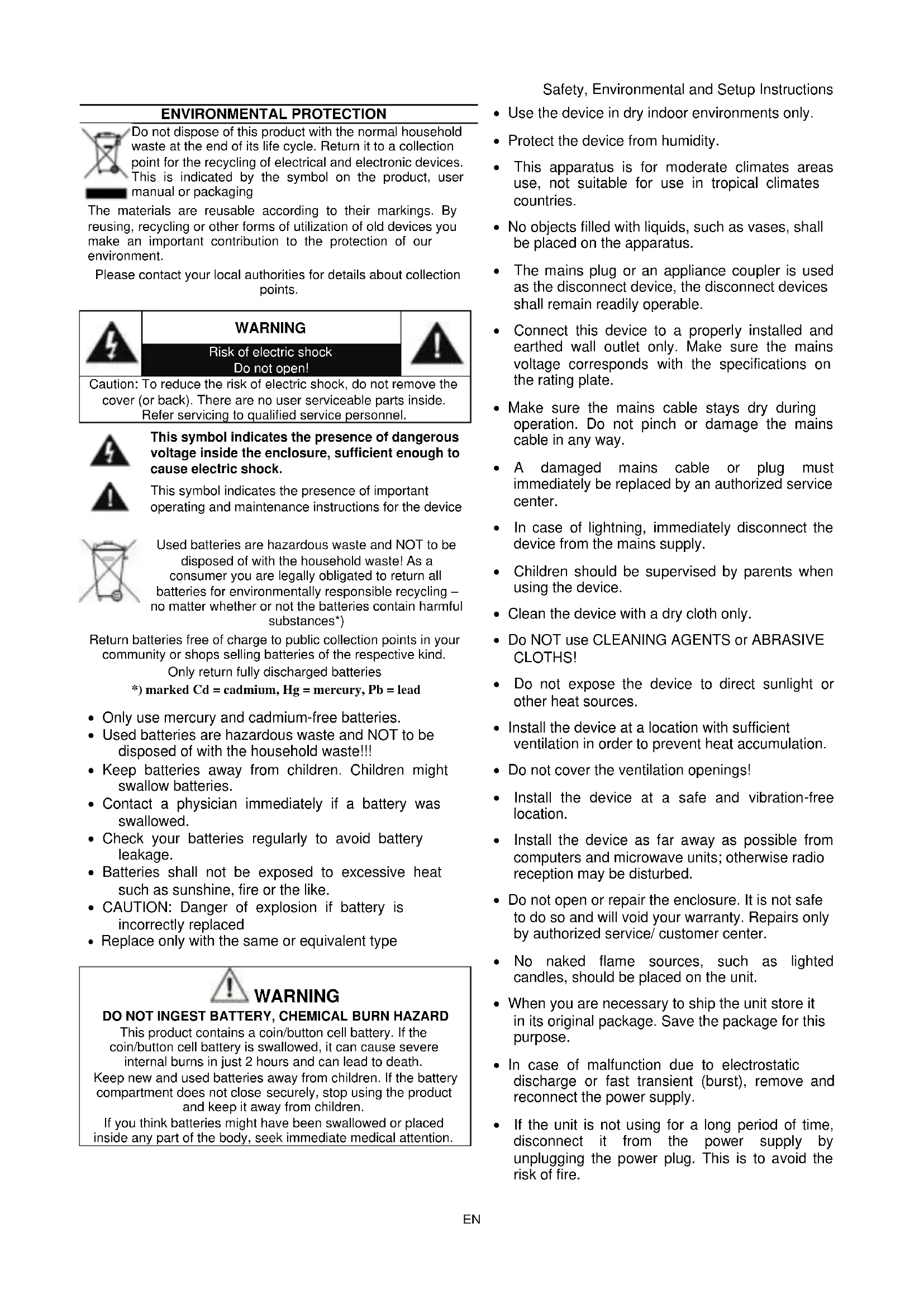 - Only use mercury and cadmium-free batteries.
