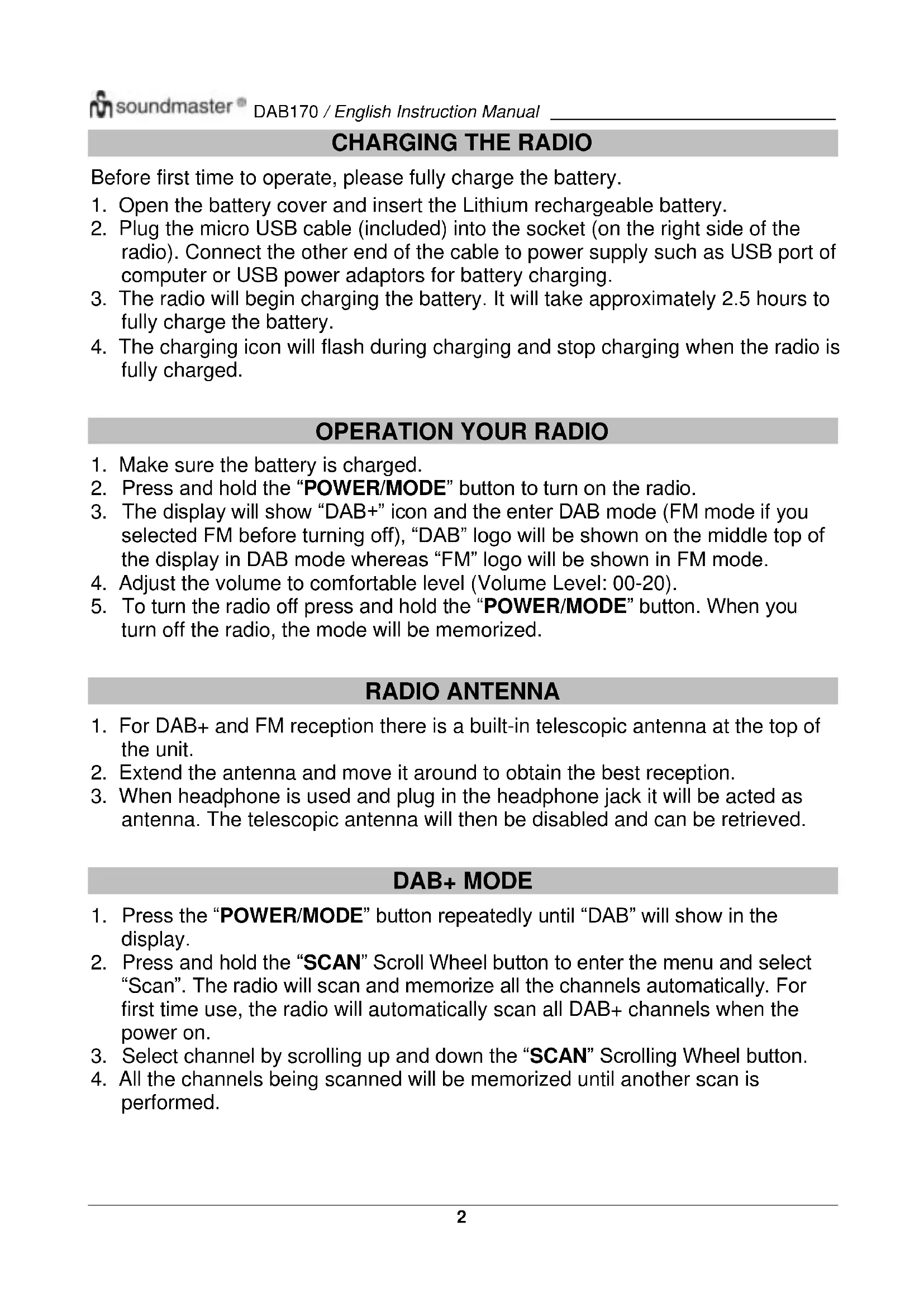 Download the instructions for your Radio in PDF format for free! Find your manual DAB170SW - Soundmaster and take your electronic device back in hand. On this page are published all the documents necessary for the use of your device. DAB170SW by Soundmaster.