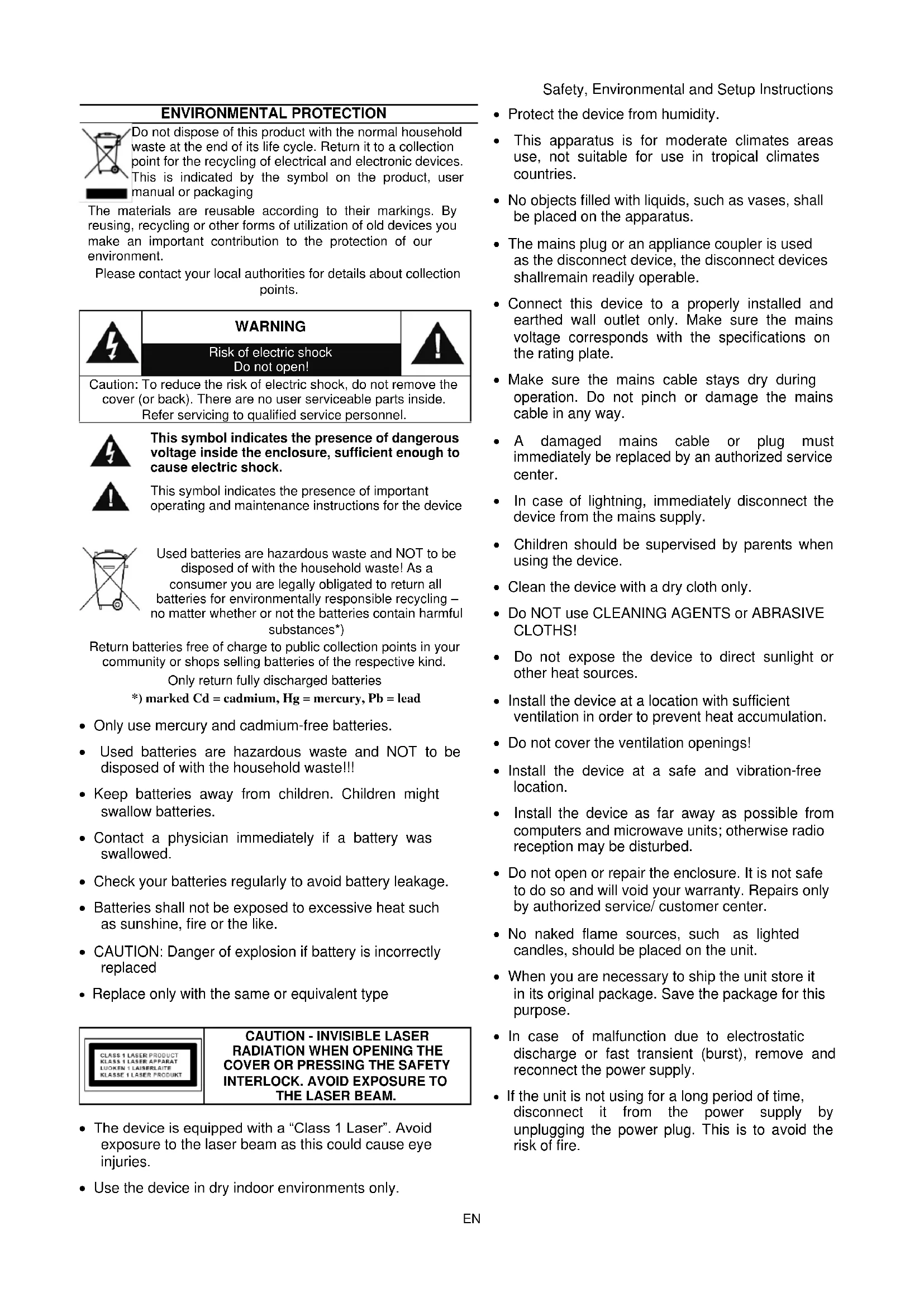 Only use mercury and cadmium-free batteries. Used batteries are hazardous waste and NOT to be disposed of with the household waste!!! Keep batteries away from children. Children might swallow batteries. Contact a physician immediately if a battery was swallowed. Check your batteries regularly to avoid battery leakage. Batteries shall not be exposed to excessive heat such as sunshine, fire or the like. CAUTION: Danger of explosion if battery is incorrectly replaced Replace only with the same or equivalent type