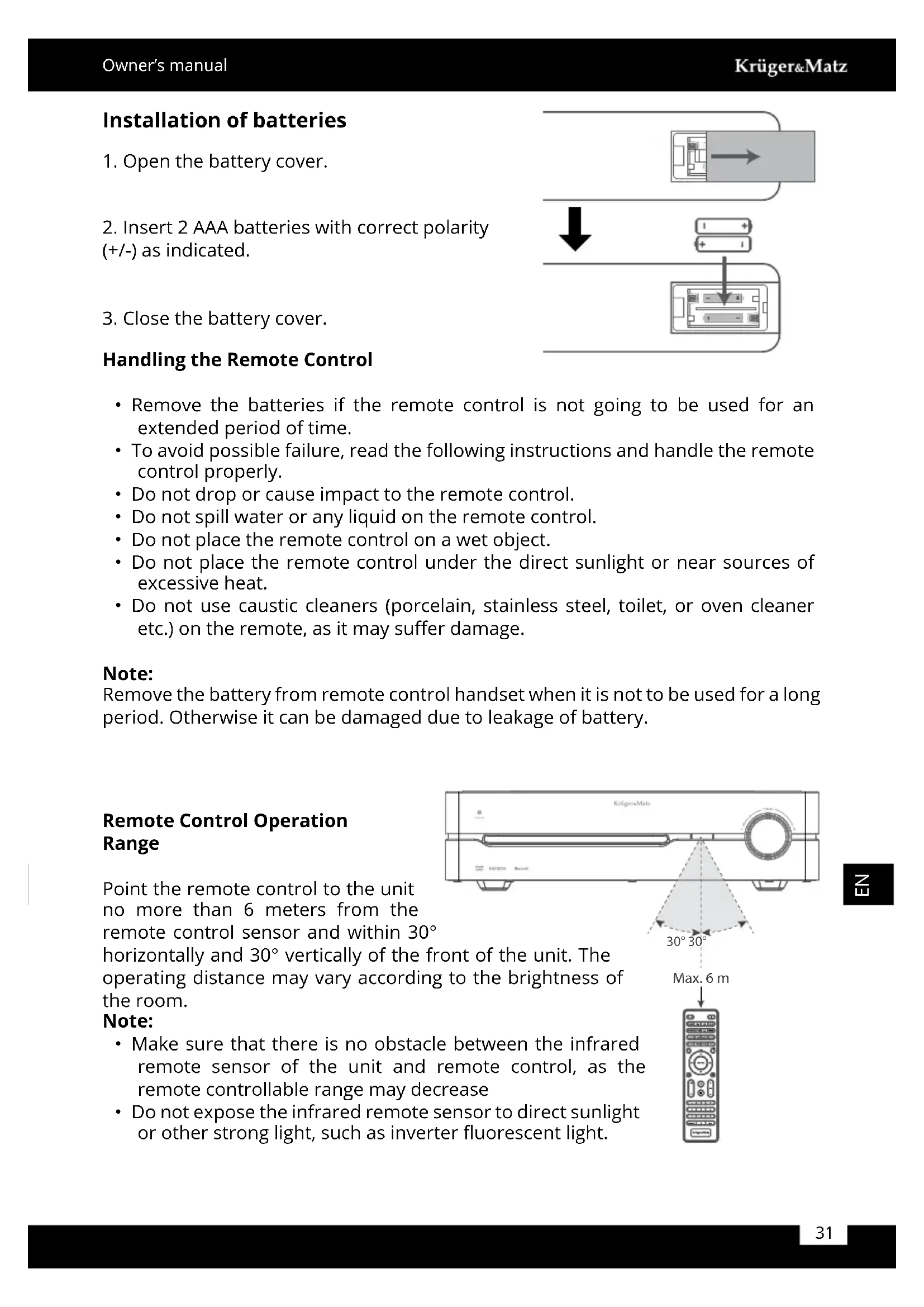 - Do not use caustic cleaners (porcelain, stainless steel, toilet, or oven cleaner etc.) on the remote, as it may suer damage. Note: Remove the battery from remote control handset when it is not to be used for a long period. Otherwise it can be damaged due to leakage of battery. Installation of batteries