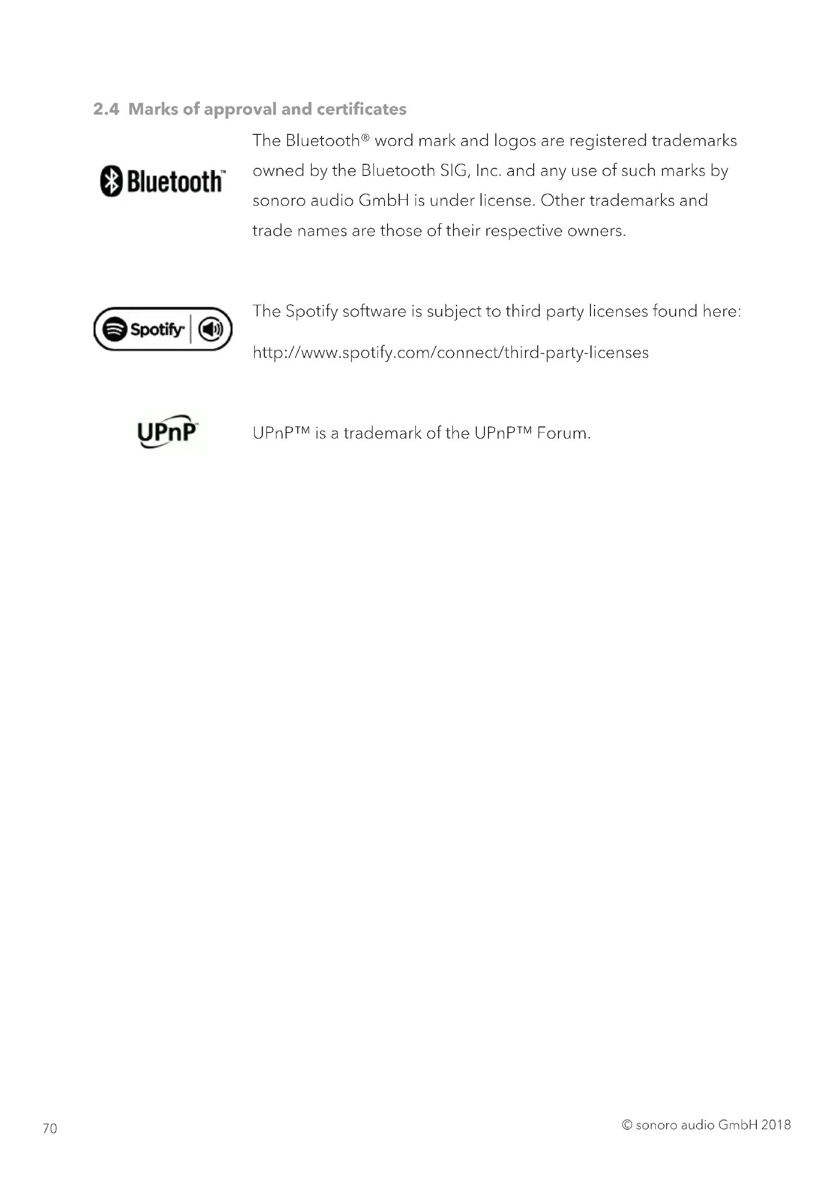 The Bluetooth® word mark and logos are registered trademarks owned by the Bluetooth SIG, Inc. and any use of such marks by sonoro audio GmbH is under license. Other trademarks and trade names are those of their respective owners. The Spotify software is subject to third party licenses found here: http://www.spotify.com/connect/third-party-licenses UPnP™ is a trademark of the UPnP™ Forum.© sonoro audio GmbH 2018