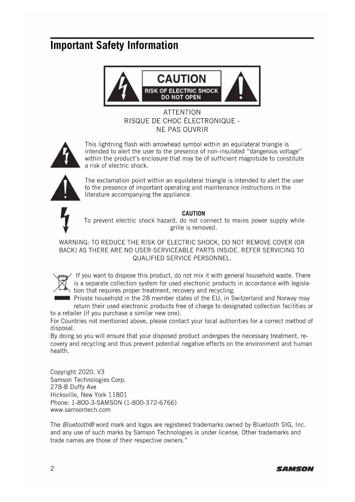 The Bluetooth® word mark and logos are registered trademarks owned by Bluetooth SIG, Inc. and any use of such marks by Samson Technologies is under license. Other trademarks and trade names are those of their respective owners."