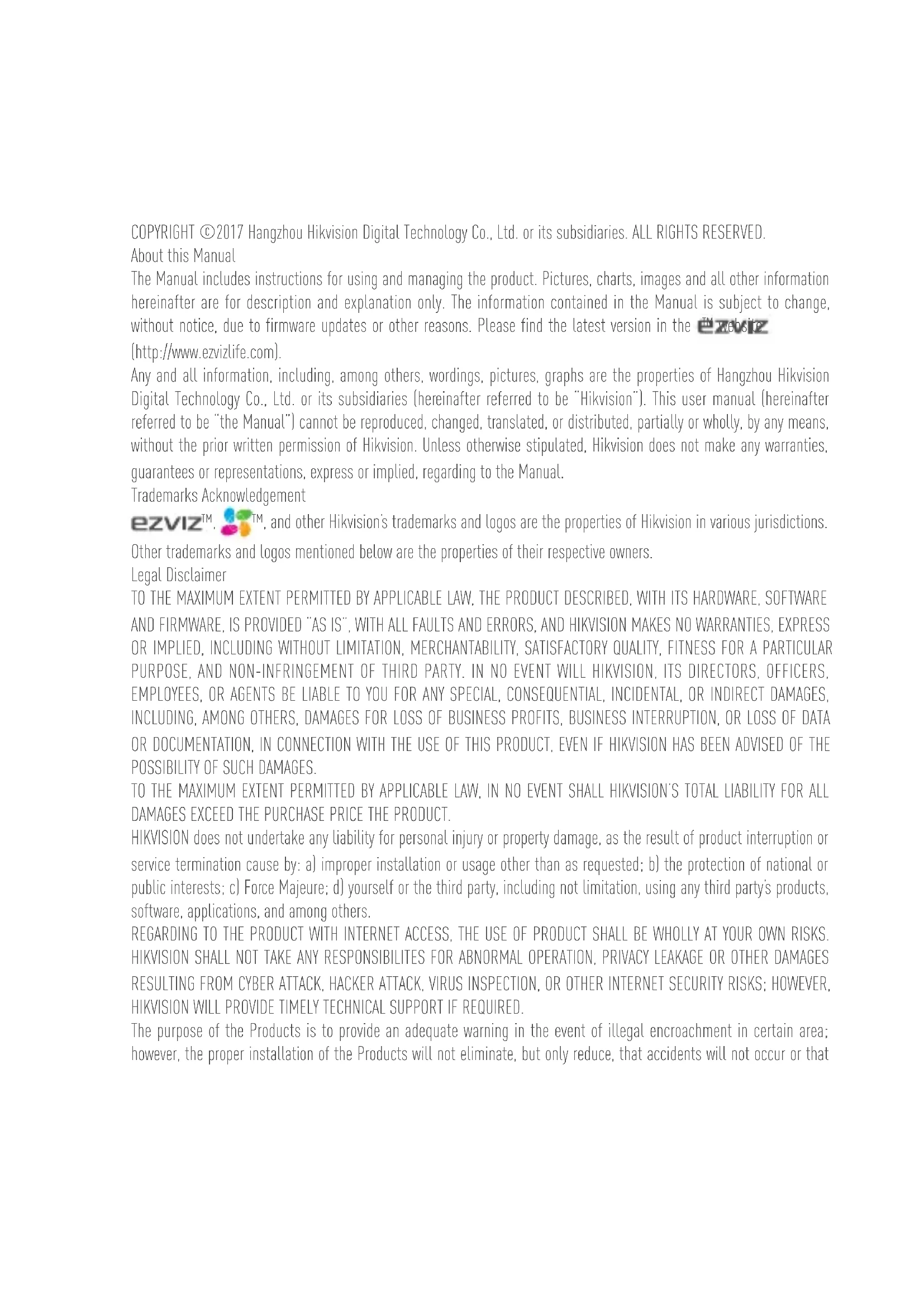 C6B UD04617B-ACOPYRIGHT ©2017 Hangzhou Hikvision Digital Technology Co., Ltd. or its subsidiaries. ALL RIGHTS RESERVED. About this Manual The Manual includes instructions for using and managing the product. Pictures, charts, images and all other information hereinafter are for description and explanation only. The information contained in the Manual is subject to change, without notice, due to firmware updates or other reasons. Please find the latest version in the ™ website (http://www.ezvizlife.com). Any and all information, including, among others, wordings, pictures, graphs are the properties of Hangzhou Hikvision Digital Technology Co., Ltd. or its subsidiaries (hereinafter referred to be “Hikvision”). This user manual (hereinafter referred to be “the Manual”) cannot be reproduced, changed, translated, or distributed, partially or wholly, by any means, without the prior written permission of Hikvision. Unless otherwise stipulated, Hikvision does not make any warranties, guarantees or representations, express or implied, regarding to the Manual. Trademarks Acknowledgement ™, ™, and other Hikvision’s trademarks and logos are the properties of Hikvision in various jurisdictions. Other trademarks and logos mentioned below are the properties of their respective owners. Legal Disclaimer TO THE MAXIMUM EXTENT PERMITTED BY APPLICABLE LAW, THE PRODUCT DESCRIBED, WITH ITS HARDWARE, SOFTWARE AND FIRMWARE, IS PROVIDED “AS IS”, WITH ALL FAULTS AND ERRORS, AND HIKVISION MAKES NO WARRANTIES, EXPRESS OR IMPLIED, INCLUDING WITHOUT LIMITATION, MERCHANTABILITY, SATISFACTORY QUALITY, FITNESS FOR A PARTICULAR PURPOSE, AND NON-INFRINGEMENT OF THIRD PARTY. IN NO EVENT WILL HIKVISION, ITS DIRECTORS, OFFICERS, EMPLOYEES, OR AGENTS BE LIABLE TO YOU FOR ANY SPECIAL, CONSEQUENTIAL, INCIDENTAL, OR INDIRECT DAMAGES, INCLUDING, AMONG OTHERS, DAMAGES FOR LOSS OF BUSINESS PROFITS, BUSINESS INTERRUPTION, OR LOSS OF DATA OR DOCUMENTATION, IN CONNECTION WITH THE USE OF THIS PRODUCT, EVEN IF HIKVISION HAS BEEN ADVISED OF THE POSSIBILITY OF SUCH DAMAGES. TO THE MAXIMUM EXTENT PERMITTED BY APPLICABLE LAW, IN NO EVENT SHALL HIKVISION’S TOTAL LIABILITY FOR ALL DAMAGES EXCEED THE PURCHASE PRICE THE PRODUCT. HIKVISION does not undertake any liability for personal injury or property damage, as the result of product interruption or service termination cause by: a) improper installation or usage other than as requested; b) the protection of national or public interests; c) Force Majeure; d) yourself or the third party, including not limitation, using any third party’s products, software, applications, and among others. REGARDING TO THE PRODUCT WITH INTERNET ACCESS, THE USE OF PRODUCT SHALL BE WHOLLY AT YOUR OWN RISKS. HIKVISION SHALL NOT TAKE ANY RESPONSIBILITES FOR ABNORMAL OPERATION, PRIVACY LEAKAGE OR OTHER DAMAGES RESULTING FROM CYBER ATTACK, HACKER ATTACK, VIRUS INSPECTION, OR OTHER INTERNET SECURITY RISKS; HOWEVER, HIKVISION WILL PROVIDE TIMELY TECHNICAL SUPPORT IF REQUIRED. The purpose of the Products is to provide an adequate warning in the event of illegal encroachment in certain area; however, the proper installation of the Products will not eliminate, but only reduce, that accidents will not occur or thatthere will be no personal injury or property loss as a result. You are highly recommended to raise your vigilance and strengthen the safety awareness in the daily life. SURVEILLANCE LAWS VARY BY JURISDICTION. PLEASE CHECK ALL RELEVANT LAWS IN YOUR JURISDICTION BEFORE USING THIS PRODUCT IN ORDER TO ENSURE THAT YOUR USE CONFORMS TO THE APPLICABLE LAW. YOU FUTHER AGREE THAT THIS PRODUCT IS ONLY FOR CIVIL USE, AND HIKVISION SHALL NOT BE LIABLE IN THE EVENT THAT THIS PRODUCT IS USED WITH ILLEGITIMATE PURPOSES, SUCH AS THIRD PARTY RIGHTS INFRINGEMENT, MEDICAL TREATMENT, SAFETY EQUIPMENT OR OTHER SITUATIONS WHERE THE PRODUCT FAILURE COULD LEAD TO DEATH OR PERSONAL INJURY, OR WEAPON OF MASS DESTRUCTION, CHEMINCAL AND BIOLOGICAL WEAPON, NUCLEAR EXPLOSION, AND ANY UNSAFE NUCLEAR ENERGY USES OR ANTI-HUMANITY USAGES. YOU SHOULD UNDERTAKE ALL RESPONSIBILITIES FOR LOSSES OR DAMAGES RESULTING FROM THE ABOVE USAGES WHATSOEVER. IN THE EVENT OF ANY CONFLICTS BETWEEN THE ABOVE AND THE APPLICABLE LAW, THE LATER PREVAILS. Regulatory Information FCC Information This device complies with Part 15 of the FCC Rules. Operation is subject to the following two conditions: (1) This device may not cause harmful interference, and (2) This device must accept any interference received, including interference that may cause undesired operation. Note: This product has been tested and found to comply with the limits for a Class B digital device, pursuant to Part 15 of the FCC Rules. These limits are designed to provide reasonable protection against harmful interference in a residential installation. This product generates, uses, and can radiate radio frequency energy and, if not installed and used in accordance with the instructions, may cause harmful interference to radio communications. However, there is no guarantee that interference will not occur in a particular installation. If this product does cause harmful interference to radio or television reception, which can be determined by turning the equipment off and on, the user is encouraged to try to correct the interference by one or more of the following measures: —Reorient or relocate the receiving antenna. —Increase the separation between the equipment and receiver. —Connect the equipment into an outlet on a circuit different from that to which the receiver is connected. —Consult the dealer or an experienced radio/TV technician for help. Please take attention that changes or modification not expressly approved by the party responsible for compliance could void the user’s authority to operate the equipment. This equipment should be installed and operated with a minimum distance 20cm between the radiator and your body. This device complies with Industry Canada lic