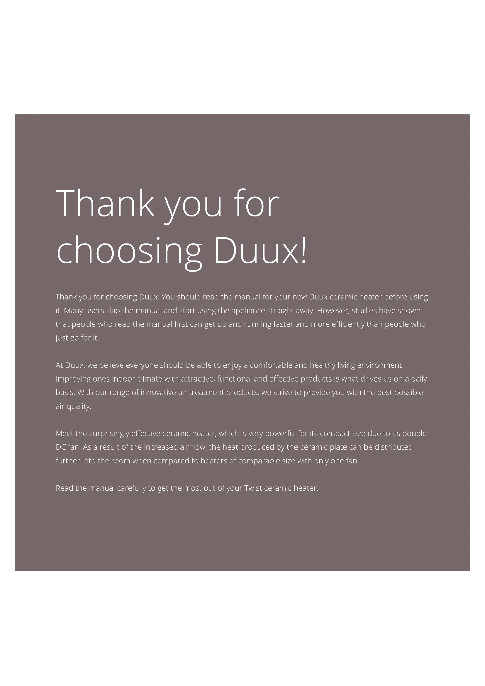user manual | gebruikershandleiding manuel d’utilisation | manual de usuario Twist ceramic heater2 Thank you for choosing Duux! Thank you for choosing Duux. You should read the manual for your new Duux ceramic heater before using it. Many users skip the manual and start using the appliance straight away. However, studies have shown that people who read the manual first can get up and running faster and more efficiently than people who just go for it. At Duux, we believe everyone should be able to enjoy a comfortable and healthy living environment. Improving ones indoor climate with attractive, functional and eective products is what drives us on a daily basis. With our range of innovative air treatment products, we strive to provide you with the best possible air quality. Meet the surprisingly eective ceramic heater, which is very powerful for its compact size due to its double DC fan. As a result of the increased air ow, the heat produced by the ceramic plate can be distributed further into the room when compared to heaters of comparable size with only one fan. Read the manual carefully to get the most out of your Twist ceramic heater.3