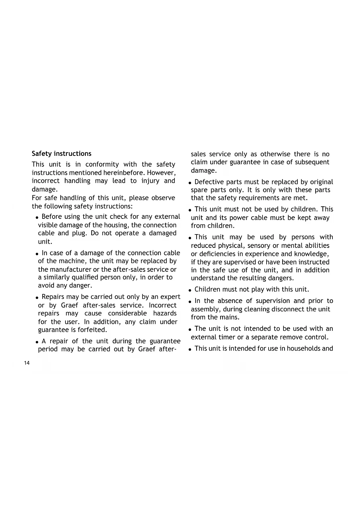 - Troubleshooting Safety instructions This unit is in conformity with the safety instructions mentioned hereinbefore. However, incorrect handling may lead to injury and damage. For safe handling of this unit, please observe the following safety instructions: Before using the unit check for any external visible damage of the housing, the connection cable and plug. Do not operate a damaged unit. In case of a damage of the connection cable of the machine, the unit may be replaced by the manufacturer or the after-sales service or a similarly qualied person only, in order to avoid any danger. Repairs may be carried out only by an expert or by Graef after-sales service. Incorrect repairs may cause considerable hazards for the user. In addition, any claim under guarantee is forfeited. A repair of the unit during the guarantee period may be carried out by Graef after- sales service only as otherwise there is no claim under guarantee in case of subsequent damage. Defective parts must be replaced by original spare parts only. It is only with these parts that the safety requirements are met. This unit must not be used by children. This unit and its power cable must be kept away from children. This unit may be used by persons with reduced physical, sensory or mental abilities or deciencies in experience and knowledge, if they are supervised or have been instructed in the safe use of the unit, and in addition understand the resulting dangers. Children must not play with this unit. In the absence of supervision and prior to assembly, during cleaning disconnect the unit from the mains. The unit is not intended to be used with an external timer or a separate remove control. This unit is intended for use in households and15 p. 2114