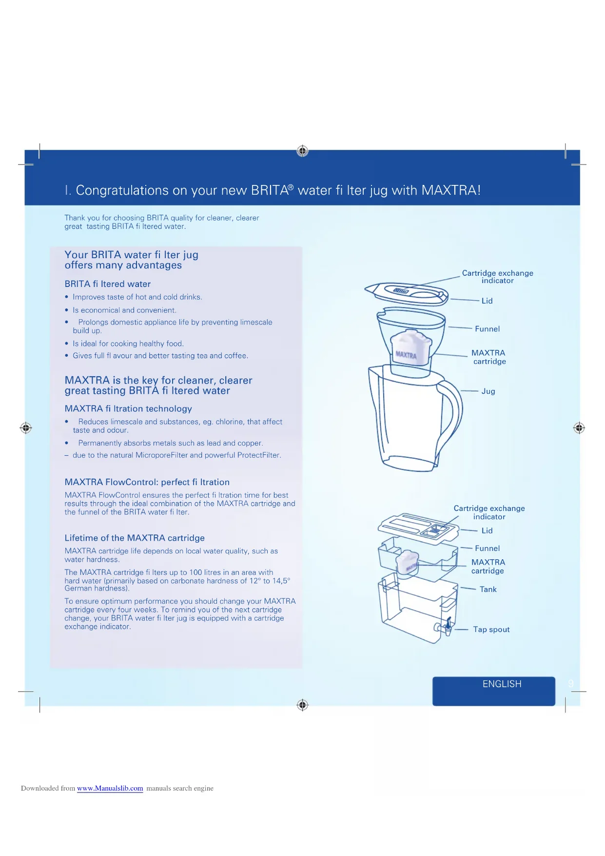 - Reduces limescale and substances, eg. chlorine, that affect taste and odour.• Permanently absorbs metals such as lead and copper.– due to the natural MicroporeFilter and powerful ProtectFilter. MAXTRA FlowControl: perfect fi ltration MAXTRA FlowControl ensures the perfect fi ltration time for best results through the ideal combination of the MAXTRA cartridge and the funnel of the BRITA water fi lter. Lifetime of the MAXTRA cartridge MAXTRA cartridge life depends on local water quality, such as water hardness.The MAXTRA cartridge fi lters up to 100 litres in an area with hard water (primarily based on carbonate hardness of 12° to 14,5° German hardness).To ensure optimum performance you should change your MAXTRA cartridge every four weeks. To remind you of the next cartridge change, your BRITA water fi lter jug is equipped with a cartridge exchange indicator. Downloaded from www.Manualslib.com manuals search engine10 ENGLISH
