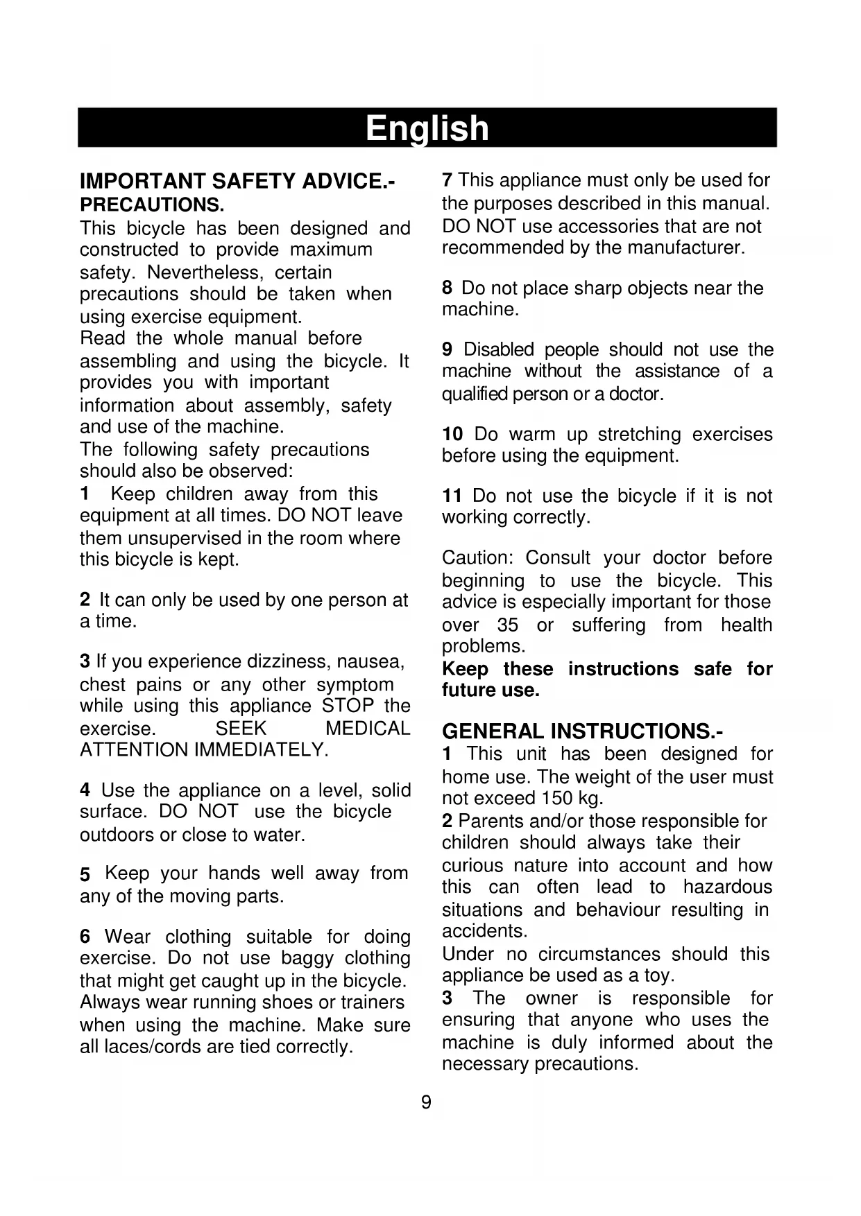 9 Disabled people should not use the machine without the assistance of a qualified person or a doctor.