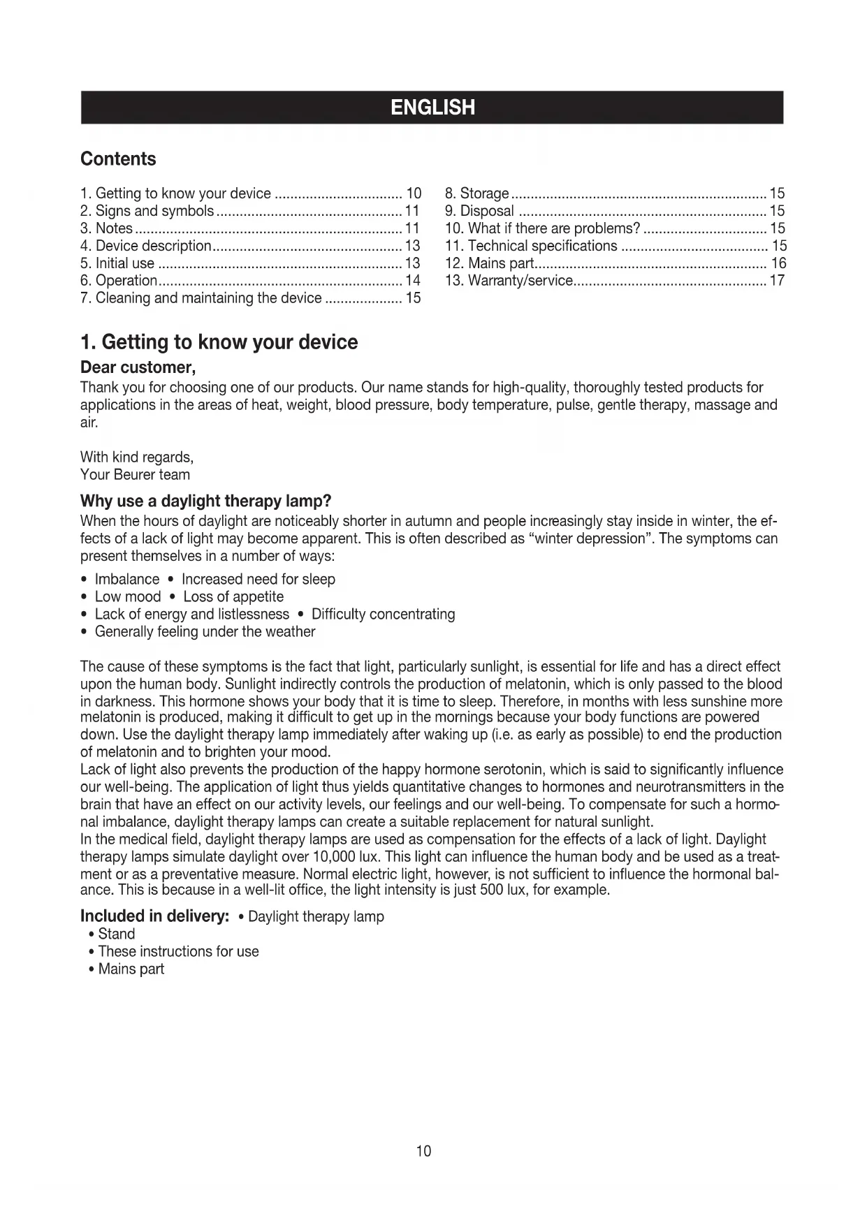 Dear customer, Thank you for choosing one of our products. Our name stands for high-quality, thoroughly tested products for applications in the areas of heat, weight, blood pressure, body temperature, pulse, gentle therapy, massage and air. With kind regards, Your Beurer team Why use a daylight therapy lamp? When the hours of daylight are noticeably shorter in autumn and people increasingly stay inside in winter, the ef- fects of a lack of light may become apparent. This is often described as “winter depression”. The symptoms can present themselves in a number of ways: