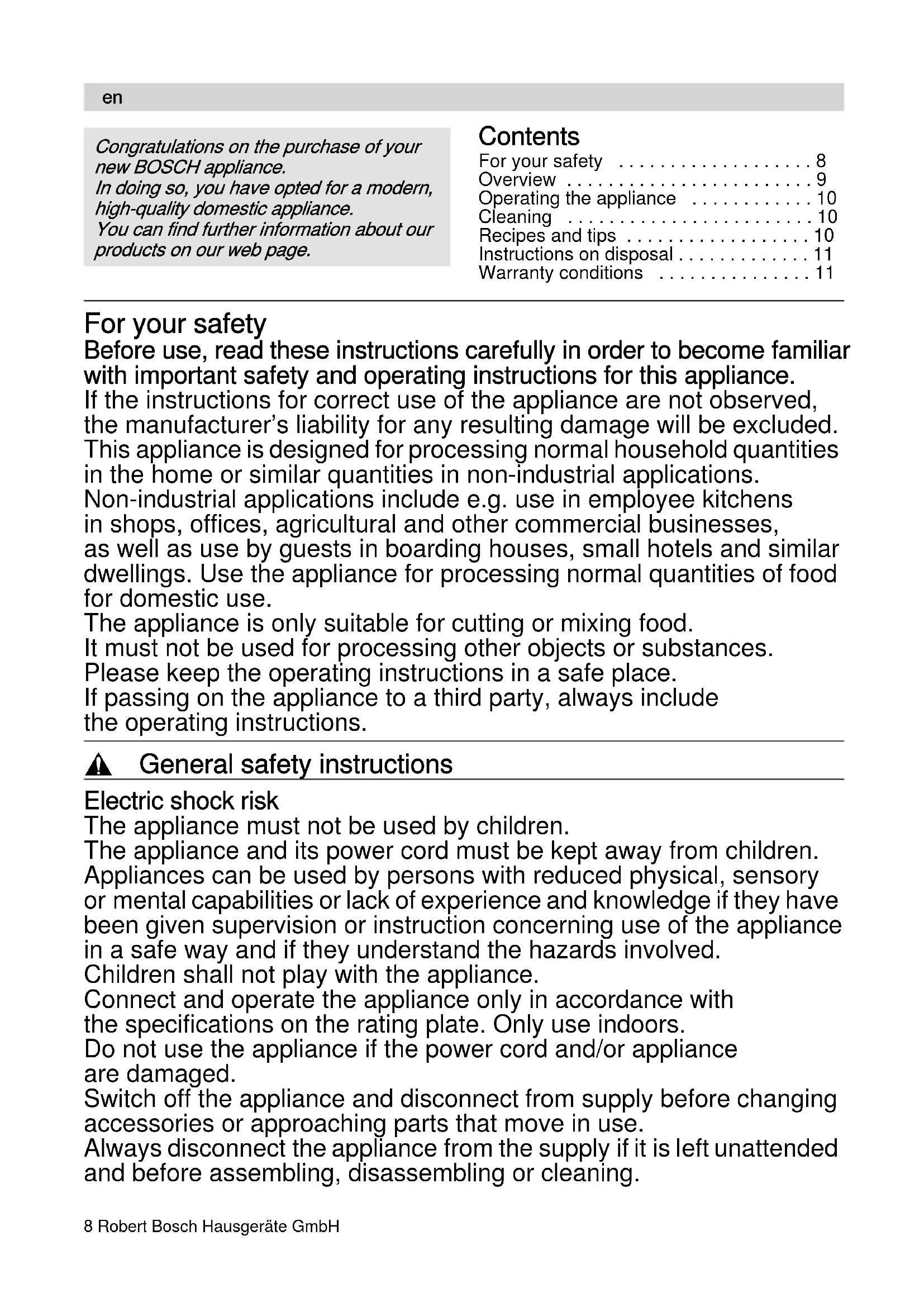 - Warranty conditions For your safety Before use, read these instructions carefully in order to become familiar with important safety and operating instructions for this appliance. If the instructions for correct use of the appliance are not observed, the manufacturer’s liability for any resulting damage will be excluded. This appliance is designed for processing normal household quantities in the home or similar quantities in non-industrial applications. Non-industrial applications include e.g. use in employee kitchens in shops, offices, agricultural and other commercial businesses, as well as use by guests in boarding houses, small hotels and similar dwellings. Use the appliance for processing normal quantities of food for domestic use. The appliance is only suitable for cutting or mixing food. It must not be used for processing other objects or substances. Please keep the operating instructions in a safe place. If passing on the appliance to a third party, always include the operating instructions. , General safety instructions Electric shock risk The appliance must not be used by children. The appliance and its power cord must be kept away from children. Appliances can be used by persons with reduced physical, sensory or mental capabilities or lack of experience and knowledge if they have been given supervision or instruction concerning use of the appliance in a safe way and if they understand the hazards involved. Children shall not play with the appliance. Connect and operate the appliance only in accordance with the specifications on the rating plate. Only use indoors. Do not use the appliance if the power cord and/or appliance are damaged. Switch off the appliance and disconnect from supply before changing accessories or approaching parts that move in use. Always disconnect the appliance from the supply if it is left unattended and before assembling, disassembling or cleaning. p. 11