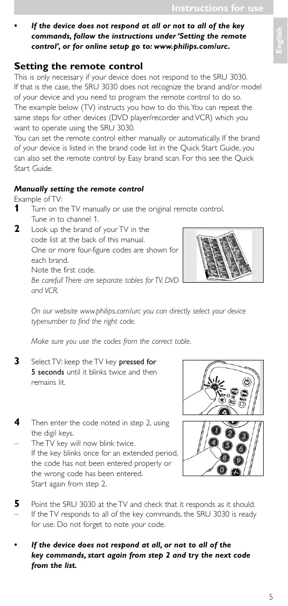 This is only necessary if your device does not respond to the SRU 3030. If that is the case, the SRU 3030 does not recognize the brand and/or model of your device and you need to program the remote control to do so. The example below (TV) instructs you how to do this.You can repeat the same steps for other devices (DVD player/recorder and VCR) which you want to operate using the SRU 3030. You can set the remote control either manually or automatically. If the brand of your device is listed in the brand code list in the Quick Start Guide, you can also set the remote control by Easy brand scan. For this see the Quick Start Guide. Manually setting the remote control Example of TV: 1 Turn on the TV manually or use the original remote control. Tune in to channel 1. 2 Look up the brand of your TV in the code list at the back of this manual. One or more four-figure codes are shown for each brand. Note the first code. Be careful! There are separate tables for TV, DVD and VCR. On our website www.philips.com/urc you can directly select your device typenumber to find the right code. Make sure you use the codes from the correct table.