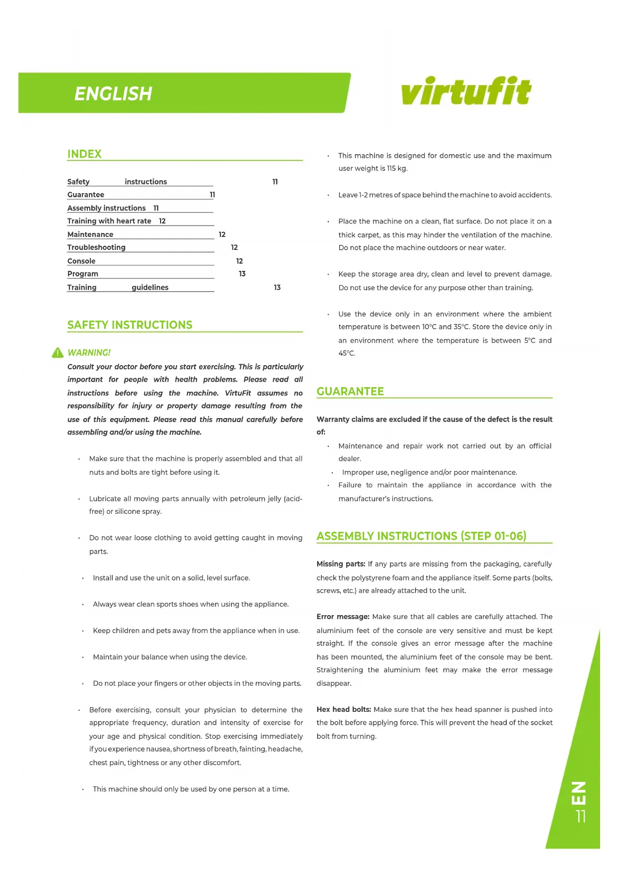 Consult your doctor before you start exercising. This is particularly important for people with health problems. Please read all instructions before using the machine. VirtuFit assumes no responsibility for injury or property damage resulting from the use of this equipment. Please read this manual carefully before assembling and/or using the machine.