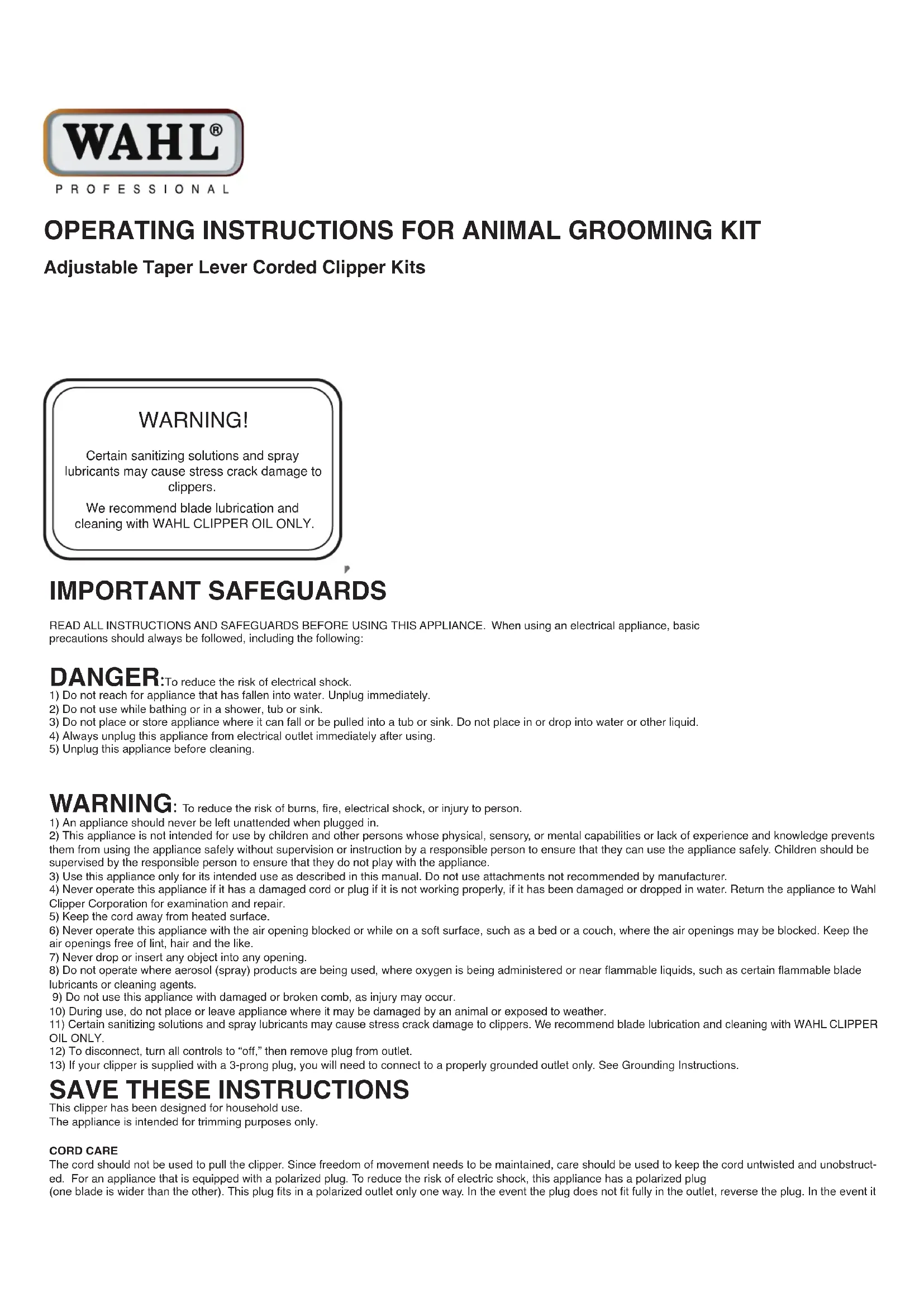 This clipper has been designed for household use. The appliance is intended for trimming purposes only. CORD CARE The cord should not be used to pull the clipper. Since freedom of movement needs to be maintained, care should be used to keep the cord untwisted and unobstruct- ed. For an appliance that is equipped with a polarized plug. To reduce the risk of electric shock, this appliance has a polarized plug (one blade is wider than the other). This plug ts in a polarized outlet only one way. In the event the plug does not t fully in the outlet, reverse the plug. In the event it WARNING! Certain sanitizing solutions and spray lubricants may cause stress crack damage to clippers. We recommend blade lubrication and cleaning with WAHL CLIPPER OIL ONLY.