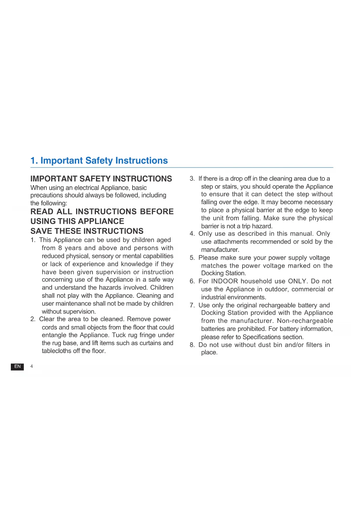 1 This Appliance can be used by children aged from 8 years and above and persons with reduced physical, sensory or mental capabilities or lack of experience and knowledge if they have been given supervision or instruction concerning use of the Appliance in a safe way and understand the hazards involved Children shall not play with the Appliance Cleaning and user maintenance shall not be made by children without supervision 2 Clear the area to be cleaned Remove power cords and small objects from the oor that could entangle the Appliance Tuck rug fringe under the rug base, and lift items such as curtains and tablecloths off the oor. 3 If there is a drop off in the cleaning area due to a step or stairs, you should operate the Appliance to ensure that it can detect the step without falling over the edge It may become necessary to place a physical barrier at the edge to keep the unit from falling Make sure the physical barrier is not a trip hazard 4 Only use as described in this manual Only use attachments recommended or sold by the manufacturer 5 Please make sure your power supply voltage matches the power voltage marked on the Docking Station 6 For INDOOR household use ONLY Do not use the Appliance in outdoor, commercial or industrial environments 7 Use only the original rechargeable battery and Docking Station provided with the Appliance from the manufacturer Non-rechargeable batteries are prohibited For battery information, please refer to Specications section. 8 Do not use without dust bin and/or filters in place