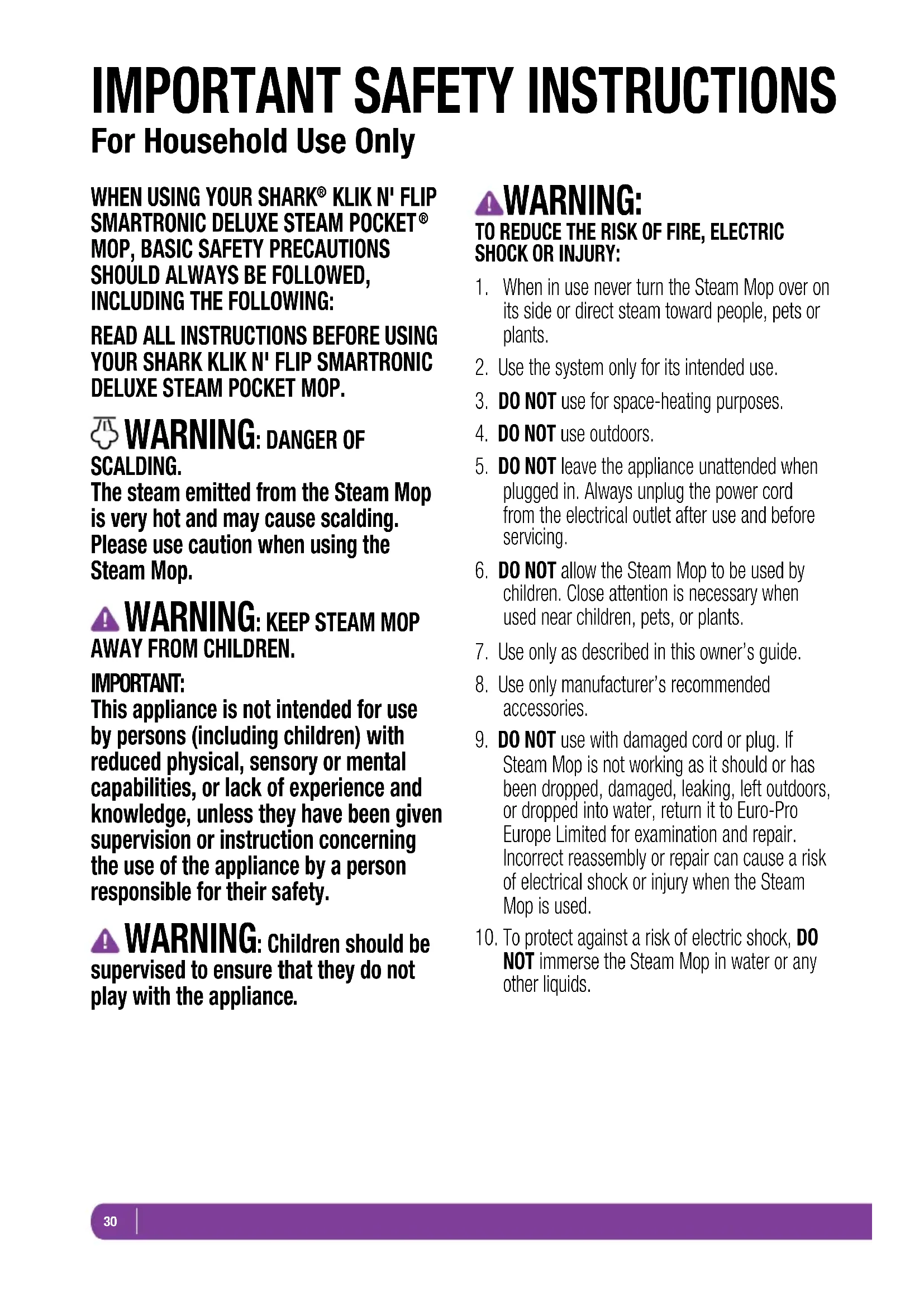 Steam Mop is not working as it should or has been dropped, damaged, leaking, left outdoors, or dropped into water, return it to Euro-Pro Europe Limited for examination and repair. Incorrect reassembly or repair can cause a risk of electrical shock or injury when the Steam Mop is used.