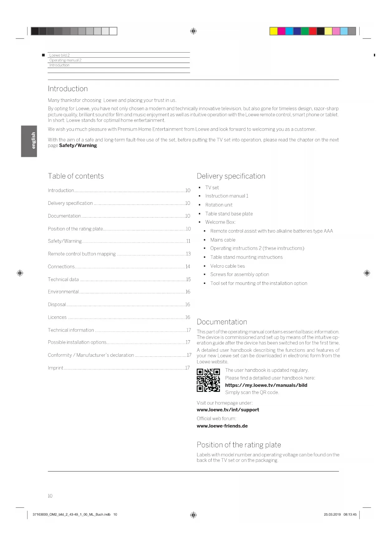 - Introduction Introduction Many thanksfor choosing Loewe and placing your trust in us. By opting for Loewe, you have not only chosen a modern and technically innovative television, but also gone for timeless design, razor-sharp picture quality, brilliant sound for film and music enjoyment as well as intuitive operation with the Loewe remote control, smart phone or tablet. In short: Loewe stands for optimal home entertainment. We wish you much pleasure with Premium Home Entertainment from Loewe and look forward to welcoming you as a customer. With the aim of a safe and long-term fault-free use of the set, before putting the TV set into operation, please read the chapter on the next page Safety/Warning. Documentation This part of the operating manual contains essential basic information. The device is commissioned and set up by means of the intuitive op- eration guide after the device has been switched on for the first time. A detailed user handbook describing the functions and features of your new Loewe set can be downloaded in electronic form from the Loewe website. The user handbook is updated regulary. Please find a detailled user handbook here: https://my.loewe.tv/manuals/bild Simply scan the QR code. Visit our homepage under: www.loewe.tv/int/support Official web forum: www.loewe-friends.de Position of the rating plate Labels with model number and operating voltage can be found on the back of the TV set or on the packaging. Delivery specification TV set Instruction manual 1 Rotation unit Table stand base plate Welcome Box: Remote control assist with two alkaline batteries type AAA Mains cable Operating instructions 2 (these instructions) Table stand mounting instructions Velcro cable ties Screws for assembly option Tool set for mounting of the installation option Table of contents Introduction p. 10