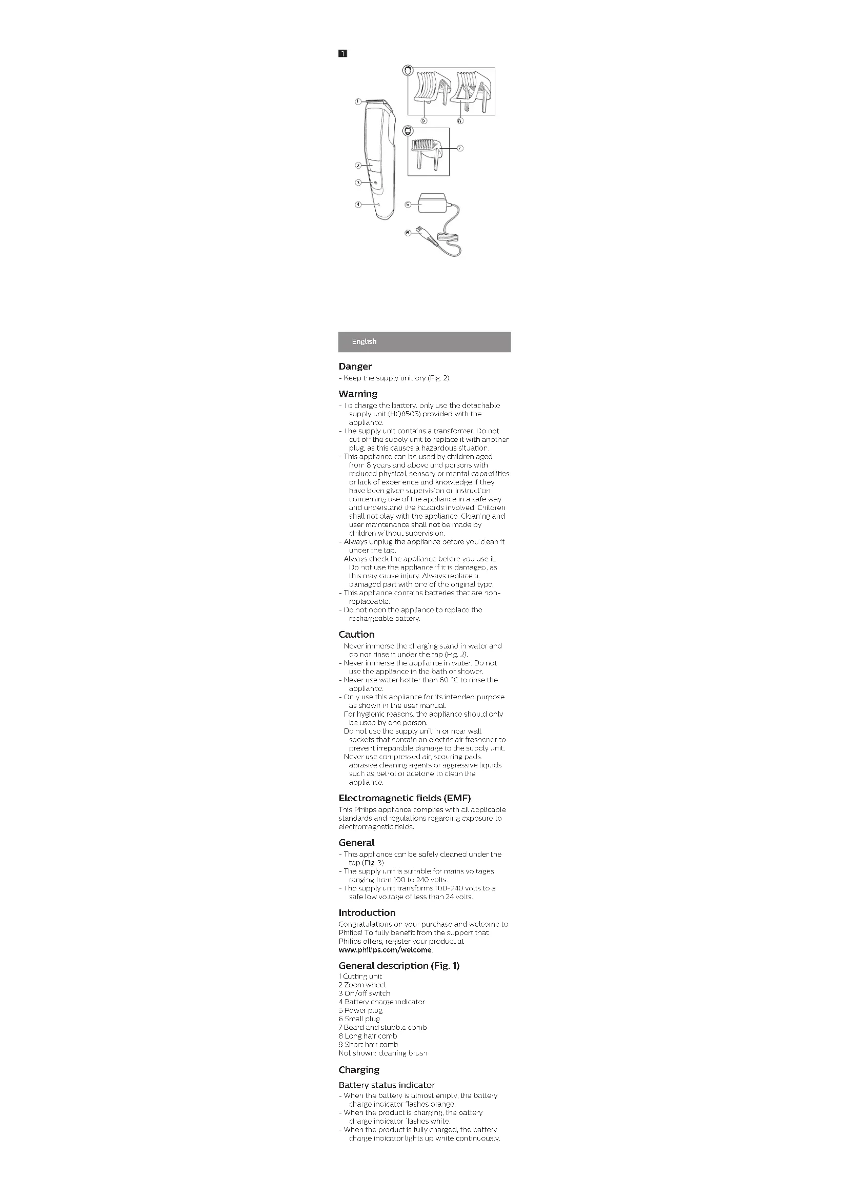 >75 % recycled paper>75 % papier recycléEnglish Danger - Keep the supply unit dry (Fig. 2). Warning - To charge the battery, only use the detachable supply unit (HQ8505) provided with the appliance. - The supply unit contains a transformer. Do not cut off the supply unit to replace it with another plug, as this causes a hazardous situation. - This appliance can be used by children aged from 8 years and above and persons with reduced physical, sensory or mental capabilities or lack of experience and knowledge if they have been given supervision or instruction concerning use of the appliance in a safe way and understand the hazards involved. Children shall not play with the appliance. Cleaning and user maintenance shall not be made by children without supervision. - Always unplug the appliance before you clean it under the tap. - Always check the appliance before you use it. Do not use the appliance if it is damaged, as this may cause injury. Always replace a damaged part with one of the original type. - This appliance contains batteries that are non- replaceable. - Do not open the appliance to replace the rechargeable battery. Caution - Never immerse the charging stand in water and do not rinse it under the tap (Fig. 2). - Never immerse the appliance in water. Do not use the appliance in the bath or shower. - Never use water hotter than 60°C to rinse the appliance. - Only use this appliance for its intended purpose as shown in the user manual. - For hygienic reasons, the appliance should only be used by one person. - Do not use the supply unit in or near wall sockets that contain an electric air freshener to prevent irreparable damage to the supply unit. - Never use compressed air, scouring pads, abrasive cleaning agents or aggressive liquids such as petrol or acetone to clean the appliance. Electromagnetic fields (EMF) This Philips appliance complies with all applicable standards and regulations regarding exposure to electromagnetic fields. General - This appliance can be safely cleaned under the tap (Fig. 3). - The supply unit is suitable for mains voltages ranging from 100 to 240 volts. - The supply unit transforms 100-240 volts to a safe low voltage of less than 24 volts. Introduction Congratulations on your purchase and welcome to Philips! To fully benefit from the support that Philips offers, register your product at www.philips.com/welcome. General description (Fig. 1) 1 Cutting unit 2 Zoom wheel 3 On/off switch 4 Battery charge indicator 5 Power plug 6 Small plug 7 Beard and stubble comb 8 Long hair comb 9 Short hair comb Not shown: cleaning brush Charging Battery status indicator - When the battery is almost empty, the battery charge indicator flashes orange. - When the product is charging, the battery charge indicator flashes white. - When the product is fully charged, the battery charge indicator lights up white continuously.