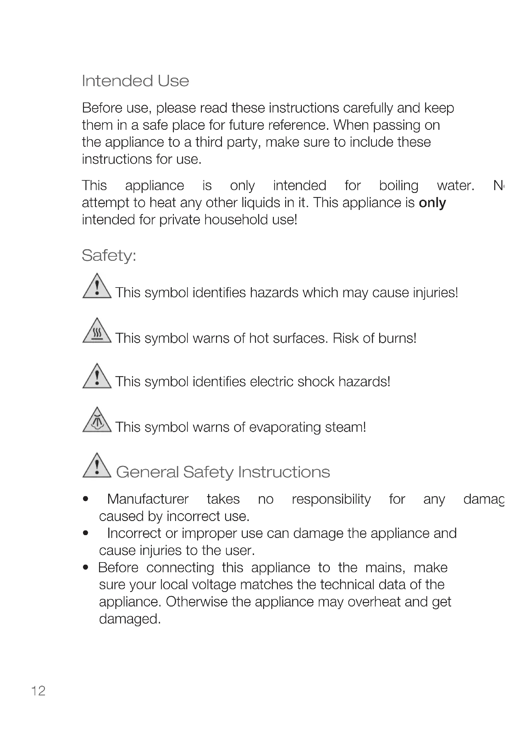 - Before connecting this appliance to the mains, make sure your local voltage matches the technical data of the appliance. Otherwise the appliance may overheat and get damaged.Instruction Manual ENGLISH