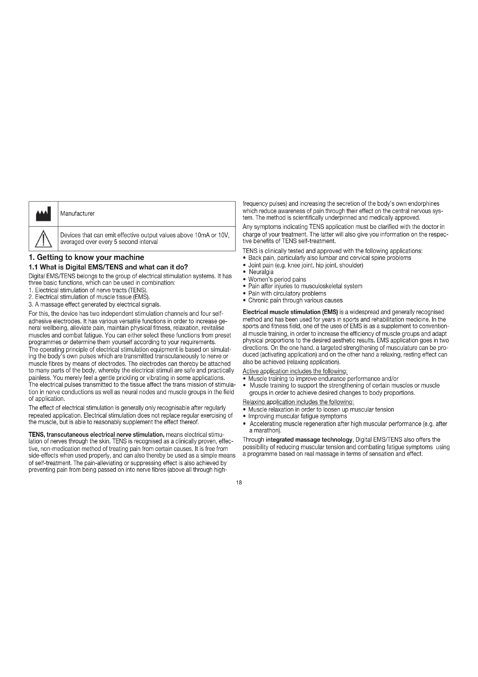 For this, the device has two independent stimulation channels and four self- adhesive electrodes. It has various versatile functions in order to increase ge- neral wellbeing, alleviate pain, maintain physical fitness, relaxation, revitalise muscles and combat fatigue. You can either select these functions from preset programmes or determine them yourself according to your requirements. The operating principle of electrical stimulation equipment is based on simulat- ing the body’s own pulses which are transmitted transcutaneously to nerve or muscle fibres by means of electrodes. The electrodes can thereby be attached to many parts of the body, whereby the electrical stimuli are safe and practically painless. You merely feel a gentle prickling or vibrating in some applications. The electrical pulses transmitted to the tissue affect the trans mission of stimula- tion in nerve conductions as well as neural nodes and muscle groups in the field of application. The effect of electrical stimulation is generally only recognisable after regularly repeated application. Electrical stimulation does not replace regular exercising of the muscle, but is able to reasonably supplement the effect thereof. TENS, transcutaneous electrical nerve stimulation, means electrical stimu- lation of nerves through the skin. TENS is recognised as a clinically proven, effec- tive, non-medication method of treating pain from certain causes. It is free from side-effects when used properly, and can also thereby be used as a simple means of self-treatment. The pain-alleviating or suppressing effect is also achieved by preventing pain from being passed on into nerve fibres (above all through high- frequency pulses) and increasing the secretion of the body’s own endorphines which reduce awareness of pain through their effect on the central nervous sys- tem. The method is scientifically underpinned and medically approved. Any symptoms indicating TENS application must be clarified with the doctor in charge of your treatment. The latter will also give you information on the respec- tive benefits of TENS self-treatment. TENS is clinically tested and approved with the following applications: