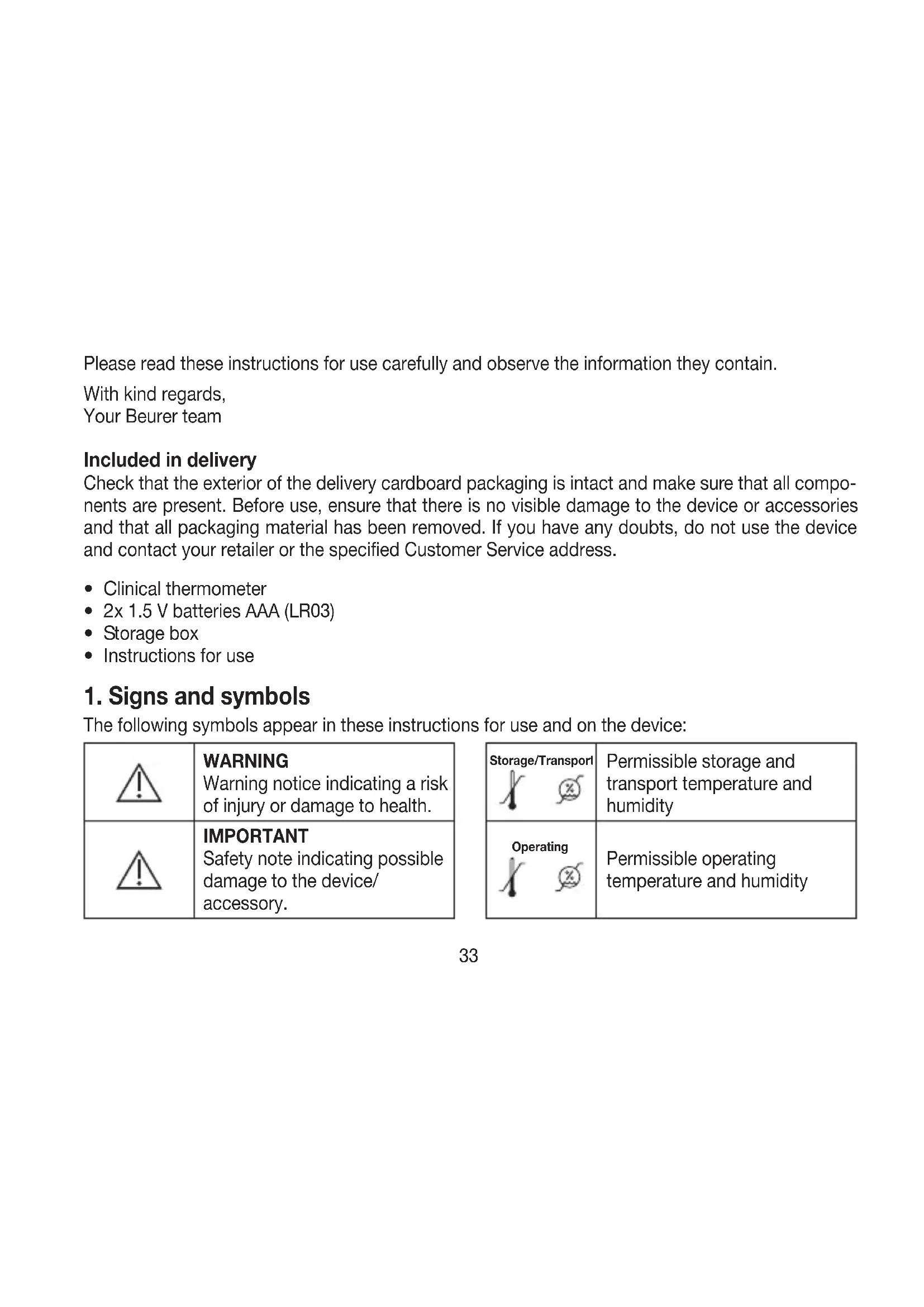 Please read these instructions for use carefully and observe the information they contain. With kind regards, Your Beurer team Included in delivery Check that the exterior of the delivery cardboard packaging is intact and make sure that all compo- nents are present. Before use, ensure that there is no visible damage to the device or accessories and that all packaging material has been removed. If you have any doubts, do not use the device and contact your retailer or the specified Customer Service address.