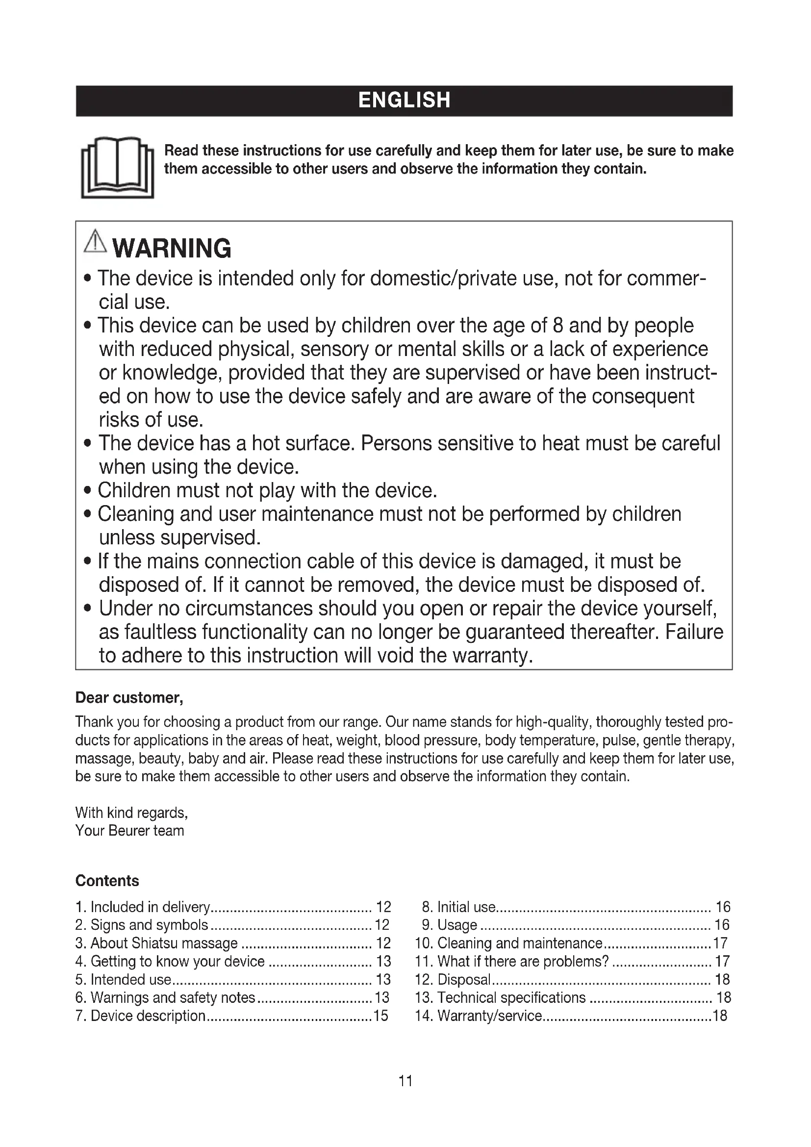 - Under no circumstances should you open or repair the device yourself, as faultless functionality can no longer be guaranteed thereafter. Failure to adhere to this instruction will void the warranty. Dear customer, Thank you for choosing a product from our range. Our name stands for high-quality, thoroughly tested pro- ducts for applications in the areas of heat, weight, blood pressure, body temperature, pulse, gentle therapy, massage, beauty, baby and air. Please read these instructions for use carefully and keep them for later use, be sure to make them accessible to other users and observe the information they contain. With kind regards, Your Beurer team ENGLISH Contents