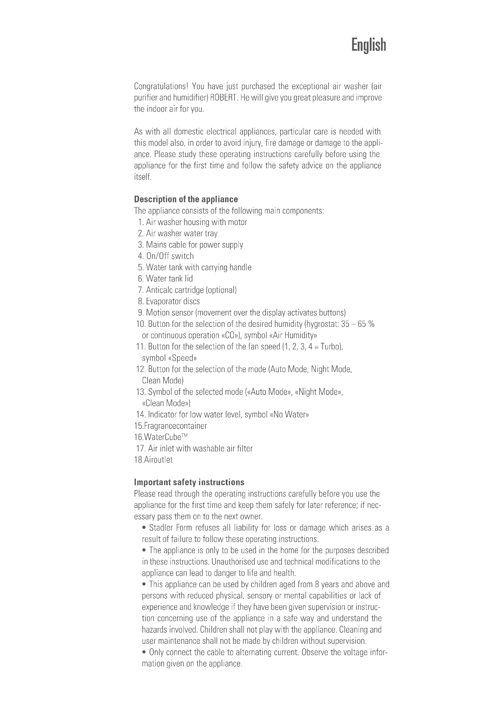 Download the instructions for your Humidifier in PDF format for free! Find your manual Robert - STADLER FORM and take your electronic device back in hand. On this page are published all the documents necessary for the use of your device. Robert by STADLER FORM.