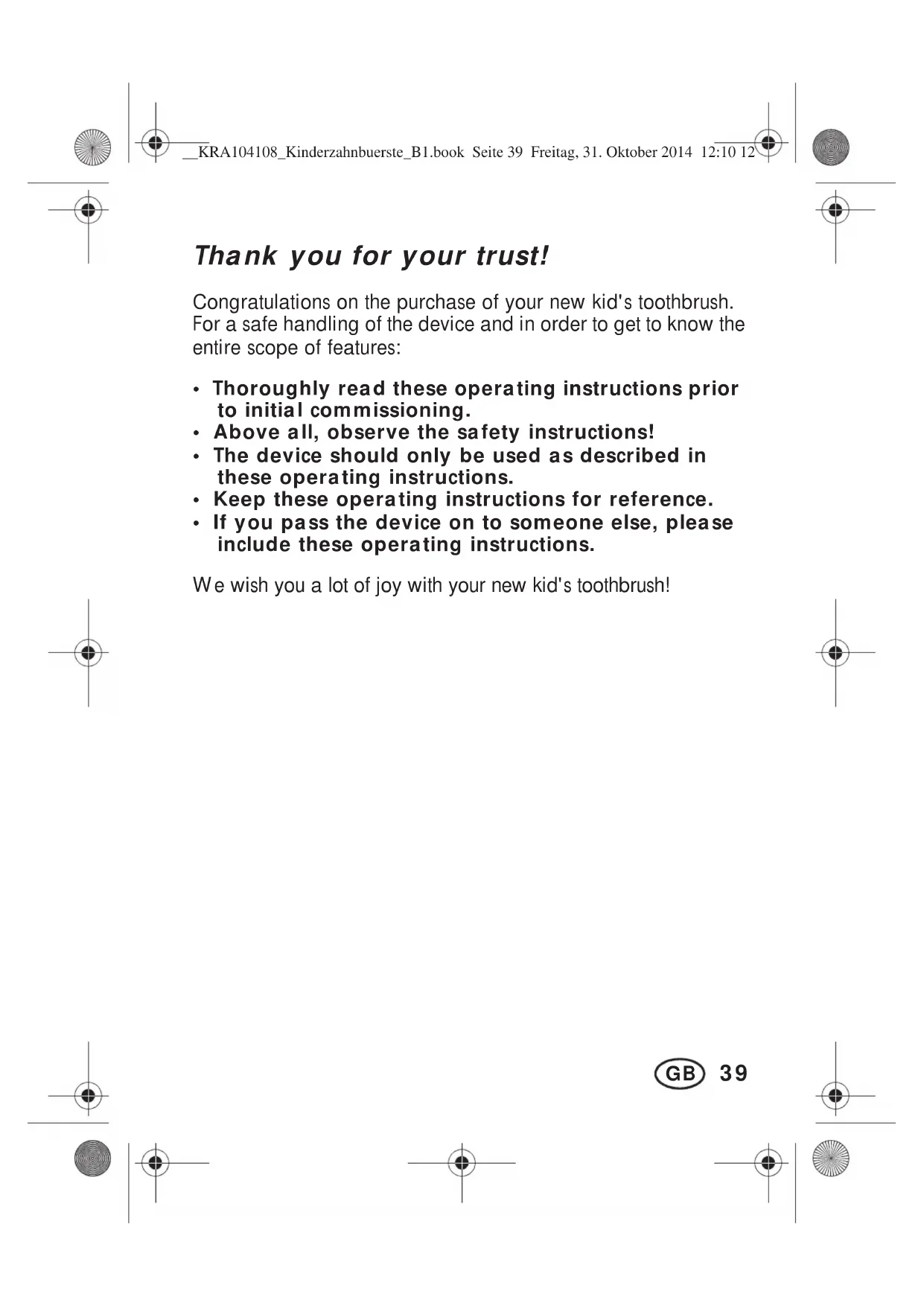 - If you pass the device on to someone else, please include these operating instructions. We wish you a lot of joy with your new kid's toothbrush! __KRA104108_Kinderzahnbuerste_B1.book Seite 39 Freitag, 31. Oktober 2014 12:10 1240