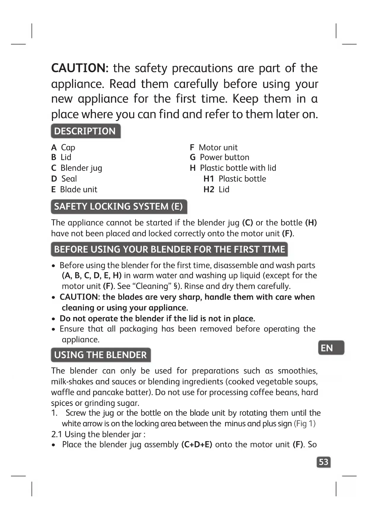 CAUTION: the safety precautions are part of the appliance. Read them carefully before using your new appliance for the first time. Keep them in a place where you can find and refer to them later on. DESCRIPTION A Cap B Lid C Blender jug D Seal E Blade unit F Motor unit G Power button H Plastic bottle with lid H1 Plastic bottle H2 Lid SAFETY LOCKING SYSTEM (E) The appliance cannot be started if the blender jug (C) or the bottle (H) have not been placed and locked correctly onto the motor unit (F). BEFORE USING YOUR BLENDER FOR THE FIRST TIME