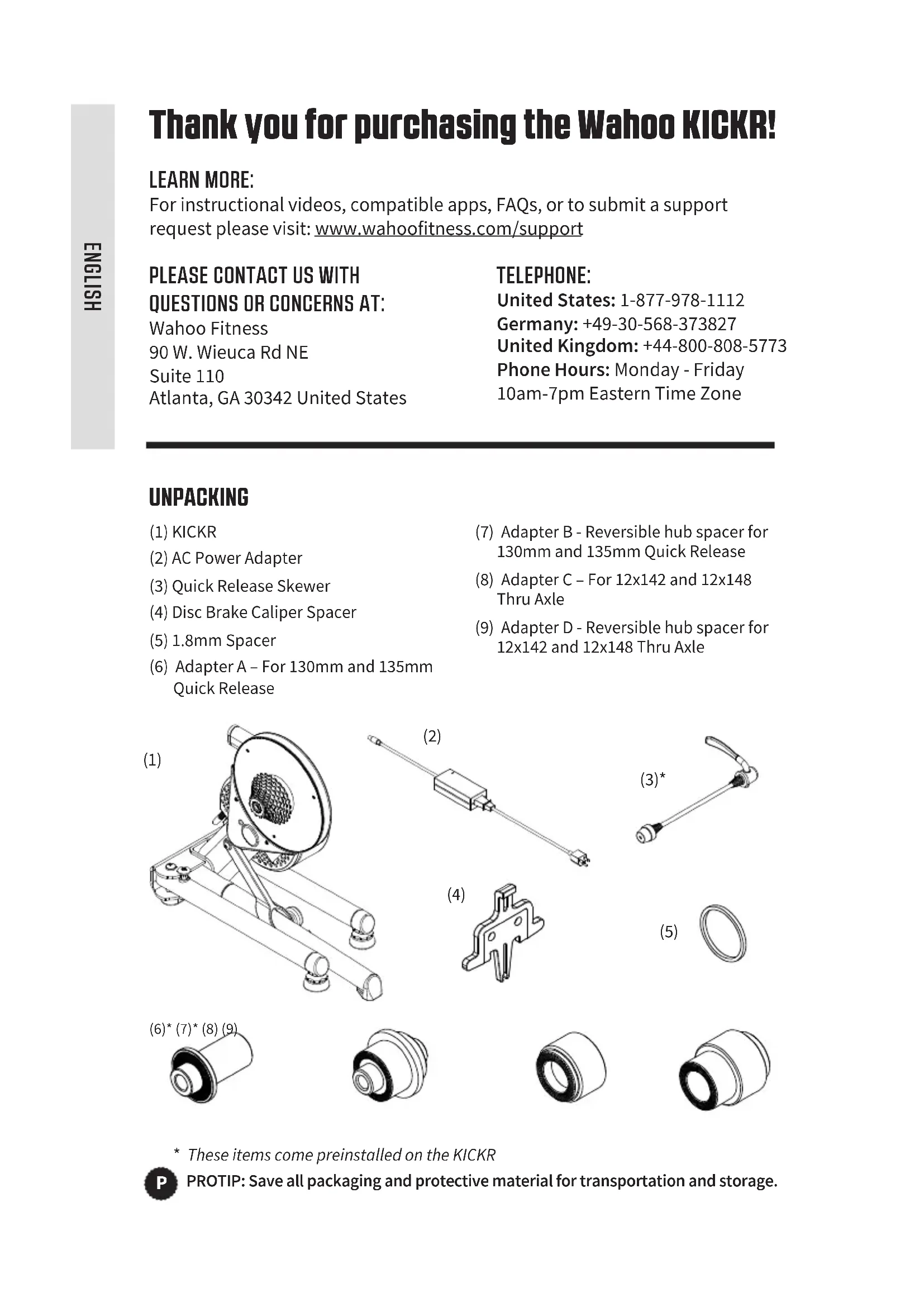 QUESTIONS OR CONCERNS AT: Wahoo Fitness 90 W. Wieuca Rd NE Suite 110 Atlanta, GA 30342 United States TELEPHONE: United States: 1-877-978-1112 Germany: +49-30-568-373827 United Kingdom: +44-800-808-5773 Phone Hours: Monday - Friday 10am-7pm Eastern Time Zone UNPACKING (1) KICKR (2) AC Power Adapter (3) Quick Release Skewer (4) Disc Brake Caliper Spacer (5) 1.8mm Spacer (6) Adapter A – For 130mm and 135mm Quick Release (7) Adapter B - Reversible hub spacer for 130mm and 135mm Quick Release (8) Adapter C – For 12x142 and 12x148 Thru Axle (9) Adapter D - Reversible hub spacer for 12x142 and 12x148 Thru Axle (6)* (7)* (8) (9) ENGLISH4 (2)
