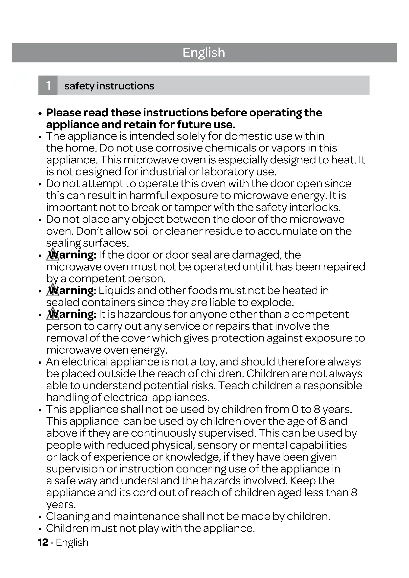 - The appliance is intended solely for domestic use within the home. Do not use corrosive chemicals or vapors in this appliance. This microwave oven is especially designed to heat. It is not designed for industrial or laboratory use.
