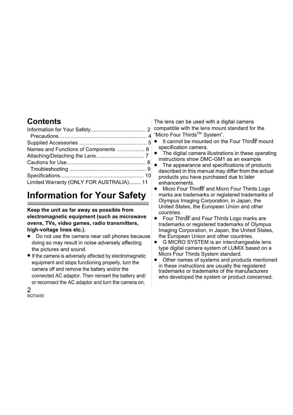 and Four Thirds Logo marks are trademarks or registered trademarks of Olympus Imaging Corporation, in Japan, the United States, the European Union and other countries. ≥ G MICRO SYSTEM is an interchangeable lens type digital camera system of LUMIX based on a Micro Four Thirds System standard. ≥ Other names of systems and products mentioned in these instructions are usually the registered trademarks or trademarks of the manufacturers who developed the system or product concerned. SQT0455_E.book 2 ページ 2014年8月18日 月曜日 午後4時29分3 SQT0455 ENGLISH -If you see this symbol- Disposal of Old Equipment Only for European Union and countries with recycling systems This symbol on the products, packaging, and/or accompanying documents means that used electrical and electronic products must not be mixed with general household waste. For proper treatment, recovery and recycling of old products, please take them to applicable collection points in accordance with your national legislation. By disposing of them correctly, you will help to save valuable resources and prevent any potential negative effects on human health and the environment. For more information about collection and recycling, please contact your local municipality. Penalties may be applicable for incorrect disposal of this waste, in accordance with national legislation. SQT0455_E.book 3 ページ 2014年8月18日 月曜日 午後4時29分4 SQT0455 ∫ Lens Care ≥ Sand and dust can damage the lens. Make sure that no sand or dust gets inside the lens or the terminals when using the lens on a beach, etc. ≥ The lens is neither waterproof nor splash- proof. If drops of water get onto the lens, wipe the lens with a dry cloth. ≥ Do not press the lens with excessive force. ≥ When there is dirt (water, oil, and fingerprints, etc.) on the surface of the lens, the picture may be affected. Lightly wipe the surface of the lens with a soft, dry cloth before and after taking pictures. ≥ Do not place the lens mount facing downwards. Do not allow the lens contact points 1 to become dirty. ∫ About Condensation (Fogging of the Lens) ≥ Condensation occurs when there are differences in temperature and humidity as described below. Condensation can cause the lens to become dirty and lead to mold and malfunctioning, so exercise caution in the following situations: – When the camera is brought indoors from outside during cold weather – When the camera is brought into an air- conditioned car – When cold air from an air conditioner is directly blown onto the lens – In humid places ≥ Put the camera into a plastic bag to allow it to acclimatize to the surrounding temperature in order to prevent condensation. If condensation occurs, turn the power off and leave it for about two hours. Once the camera acclimatizes to the surrounding temperature the condensation will go away naturally. Precautions SQT0455_E.book 4 ページ 2014年8月18日 月曜日 午後4時29分5 SQT0455 Supplied Accessories [Inspection to be performed when you unpack the unit]When removing the unit from its packing box, check that the main unit and the supplied accessories are there and also check their external appearance and functions to verify that they have not sustained any damage during distribution and transportation.If you discover any trouble, contact your vendor before using the product.Product numbers correct as of August 2014. These may be subject to change. 1 Lens Cap 2 Lens Rear Cap (The lens rear cap and lens cap are attached to the interchangeable lens at the time of purchase.) SYF0001 VFC4605