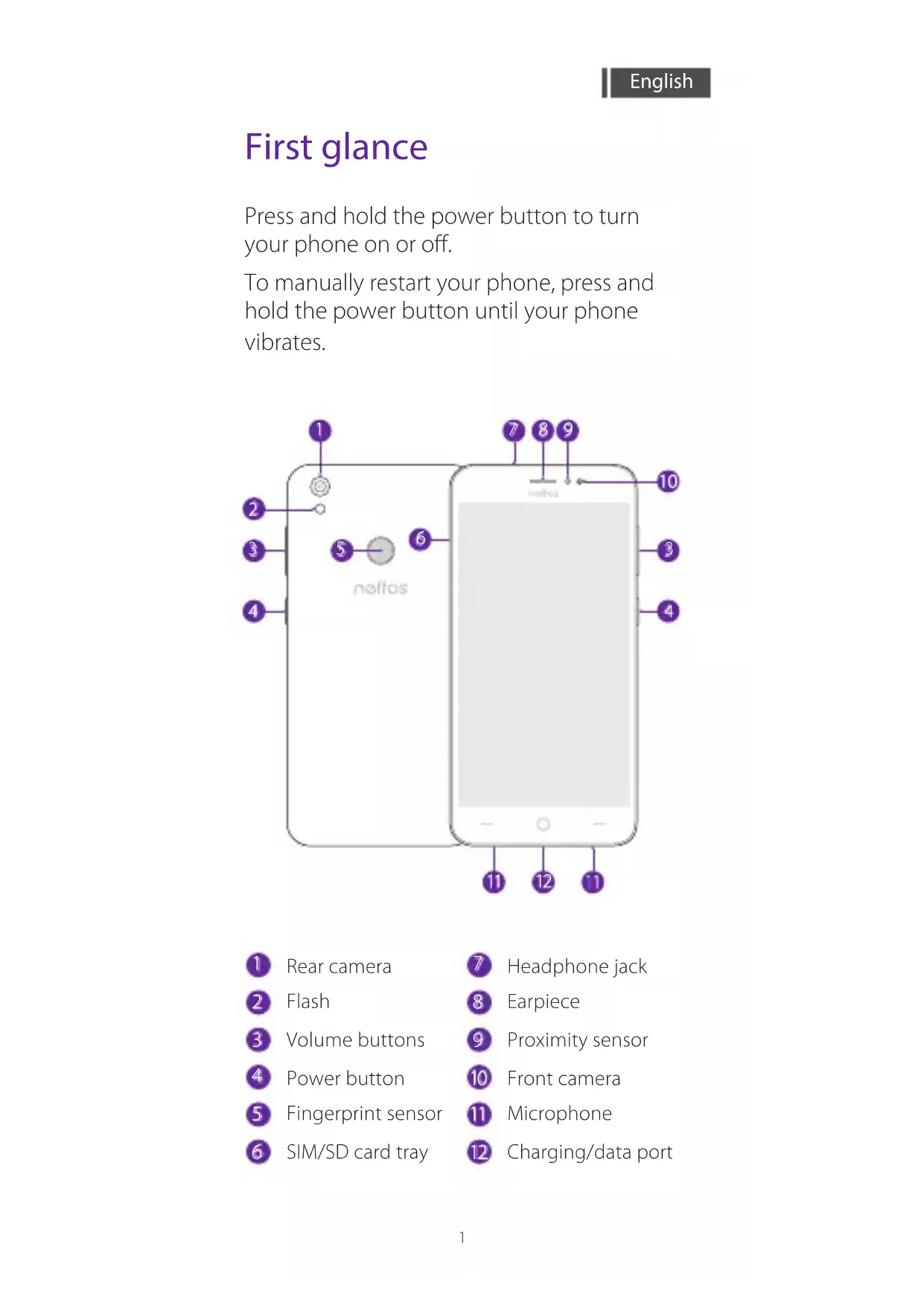 First glance English Press and hold the power button to turn your phone on or off. To manually restart your phone, press and hold the power button until your phone vibrates. Volume buttons Power button Fingerprint sensor SIM/SD card tray Flash Rear camera