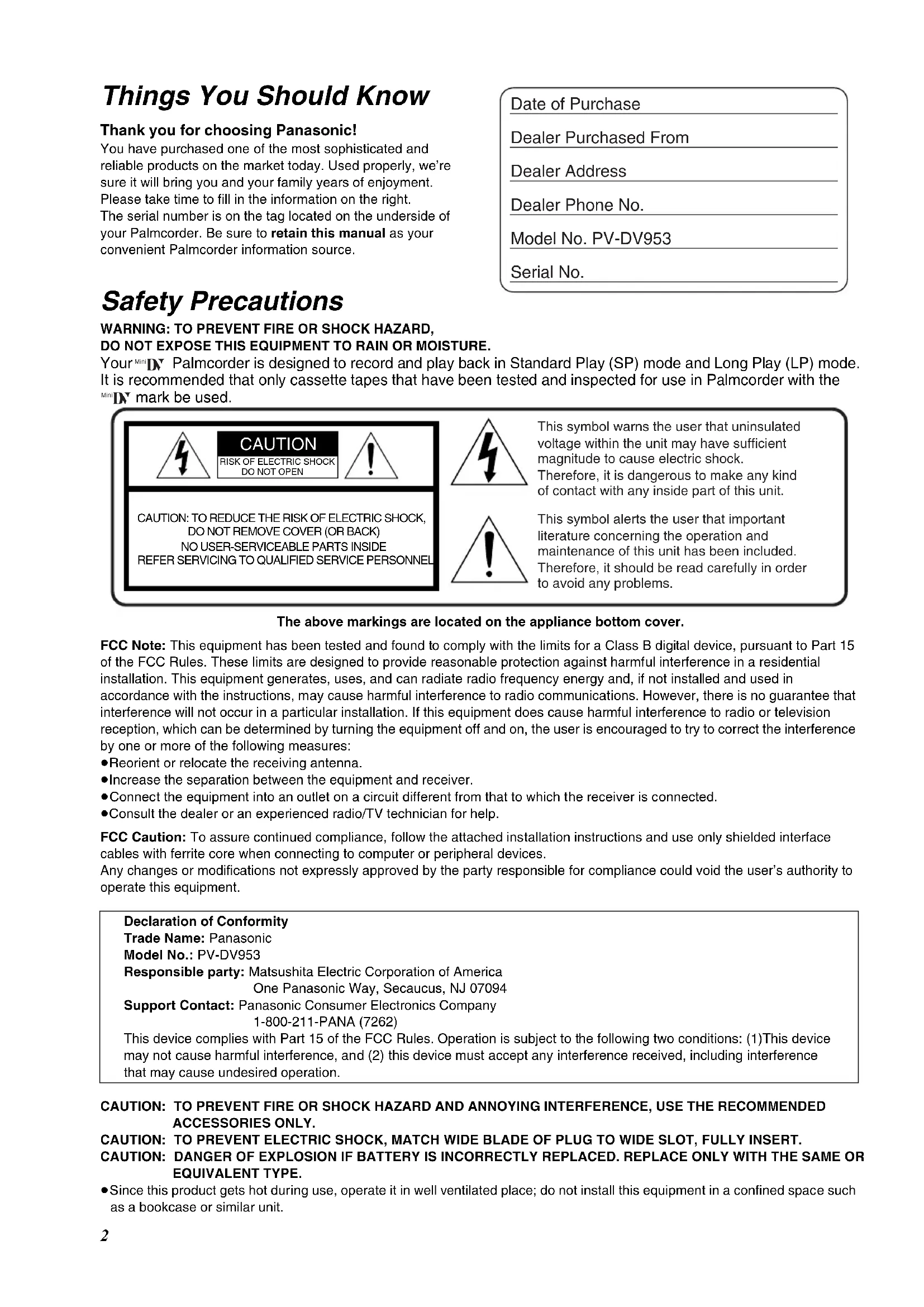Your Palmcorder is designed to record and play back in Standard Play (SP) mode and Long Play (LP) mode. It is recommended that only cassette tapes that have been tested and inspected for use in Palmcorder with the mark be used.The above markings are located on the appliance bottom cover. FCC Note: This equipment has been tested and found to comply with the limits for a Class B digital device, pursuant to Part 15 of the FCC Rules. These limits are designed to provide reasonable protection against harmful interference in a residential installation. This equipment generates, uses, and can radiate radio frequency energy and, if not installed and used in accordance with the instructions, may cause harmful interference to radio communications. However, there is no guarantee that interference will not occur in a particular installation. If this equipment does cause harmful interference to radio or television reception, which can be determined by turning the equipment off and on, the user is encouraged to try to correct the interference by one or more of the following measures:≥Reorient or relocate the receiving antenna.≥Increase the separation between the equipment and receiver. ≥Connect the equipment into an outlet on a circuit different from that to which the receiver is connected. ≥Consult the dealer or an experienced radio/TV technician for help. FCC Caution: To assure continued compliance, follow the attached installation instructions and use only shielded interface cables with ferrite core when connecting to computer or peripheral devices. Any changes or modifications not expressly approved by the party responsible for compliance could void the user’s authority to operate this equipment.Declaration of ConformityTrade Name: PanasonicModel No.: PV-DV953Responsible party: Matsushita Electric Corporation of AmericaOne Panasonic Way, Secaucus, NJ 07094Support Contact: Panasonic Consumer Electronics Company1-800-211-PANA (7262) This device complies with Part 15 of the FCC Rules. Operation is subject to the following two conditions: (1)This device may not cause harmful interference, and (2) this device must accept any interference received, including interference that may cause undesired operation.CAUTION: TO PREVENT FIRE OR SHOCK HAZARD AND ANNOYING INTERFERENCE, USE THE RECOMMENDED ACCESSORIES ONLY.CAUTION: TO PREVENT ELECTRIC SHOCK, MATCH WIDE BLADE OF PLUG TO WIDE SLOT, FULLY INSERT.CAUTION: DANGER OF EXPLOSION IF BATTERY IS INCORRECTLY REPLACED. REPLACE ONLY WITH THE SAME OR EQUIVALENT TYPE. ≥Since this product gets hot during use, operate it in well ventilated place; do not install this equipment in a confined space such as a bookcase or similar unit.
