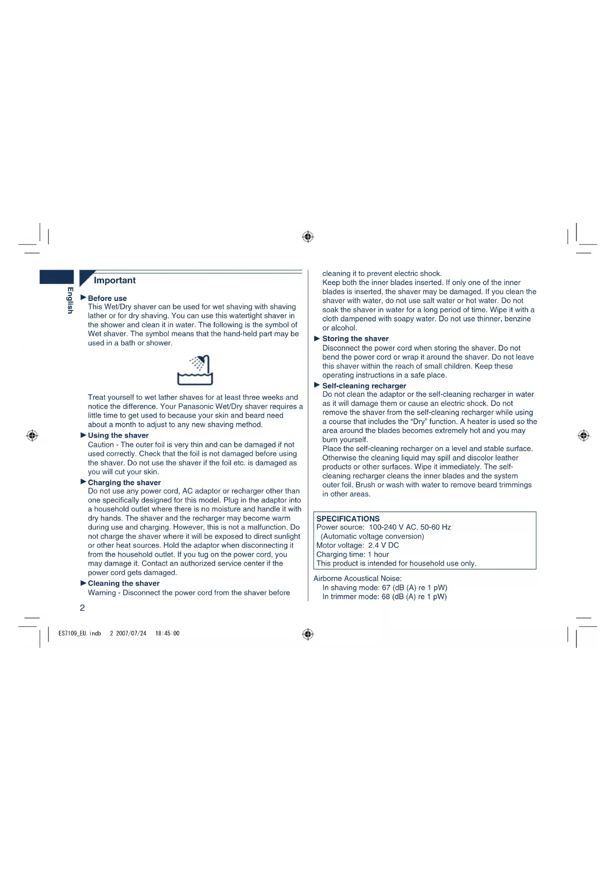 cleaning it to prevent electric shock. Keep both the inner blades inserted. If only one of the inner blades is inserted, the shaver may be damaged. If you clean the shaver with water, do not use salt water or hot water. Do not soak the shaver in water for a long period of time. Wipe it with a cloth dampened with soapy water. Do not use thinner, benzine or alcohol. Storing the shaver Disconnect the power cord when storing the shaver. Do not bend the power cord or wrap it around the shaver. Do not leave this shaver within the reach of small children. Keep these operating instructions in a safe place. Self-cleaning recharger Do not clean the adaptor or the self-cleaning recharger in water as it will damage them or cause an electric shock. Do not remove the shaver from the self-cleaning recharger while using a course that includes the “Dry” function. A heater is used so the area around the blades becomes extremely hot and you may burn yourself. Place the self-cleaning recharger on a level and stable surface. Otherwise the cleaning liquid may spill and discolor leather products or other surfaces. Wipe it immediately. The self- cleaning recharger cleans the inner blades and the system outer foil. Brush or wash with water to remove beard trimmings in other areas. SPECIFICATIONS Power source: 100-240 V AC, 50-60 Hz (Automatic voltage conversion) Motor voltage: 2.4 V DC Charging time: 1 hour This product is intended for household use only. Airborne Acoustical Noise: In shaving mode: 67 (dB (A) re 1 pW) In trimmer mode: 68 (dB (A) re 1 pW)